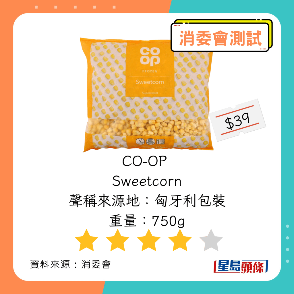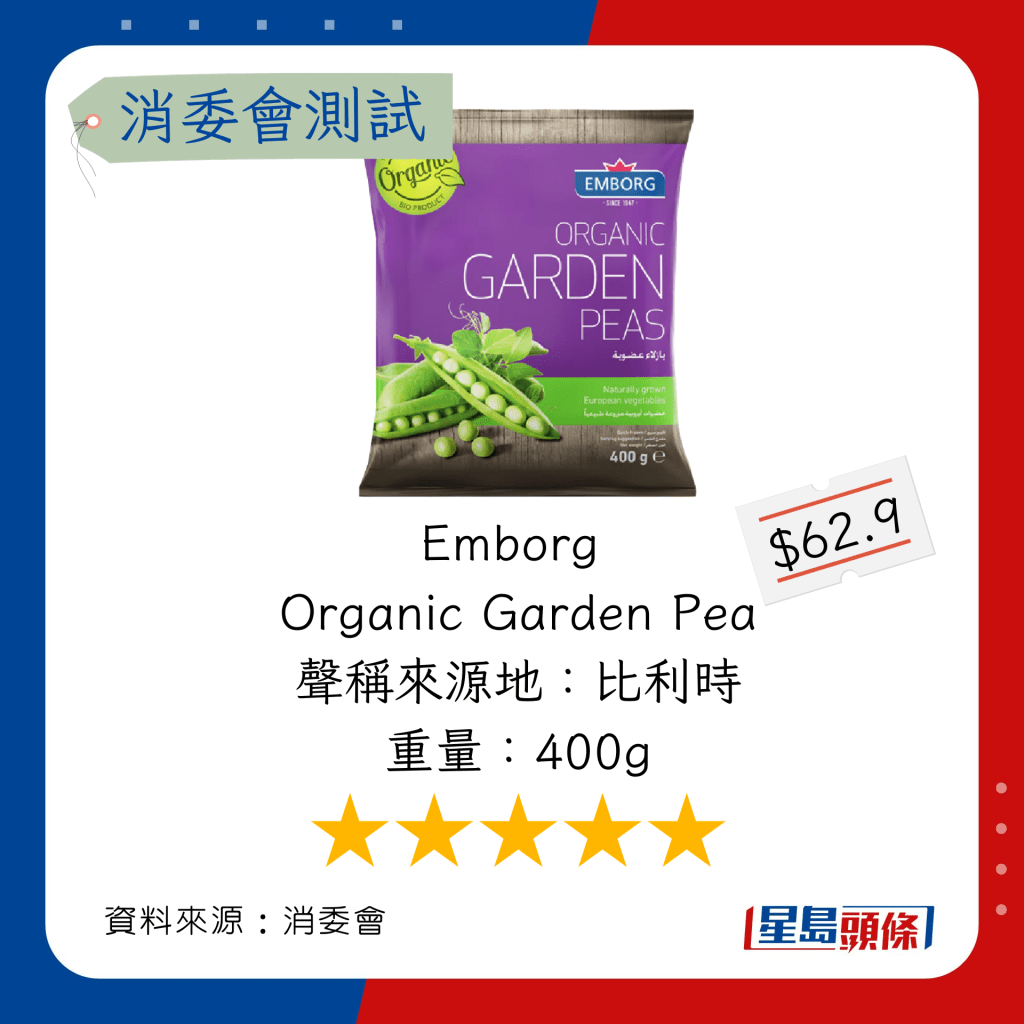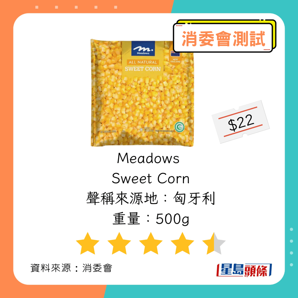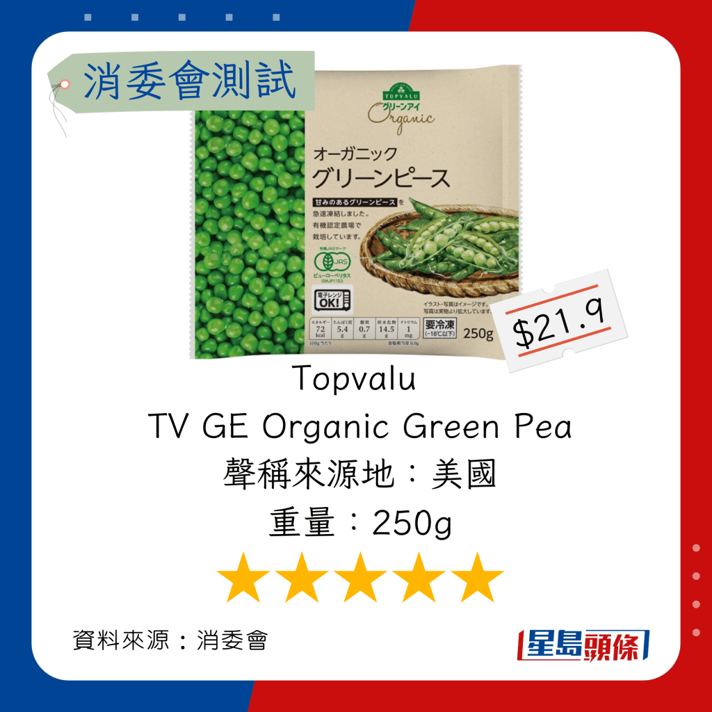 玉米粒及豌豆粒測試中,總評獲五星滿分名單如下,上榜的全是冷凍豌豆粒: