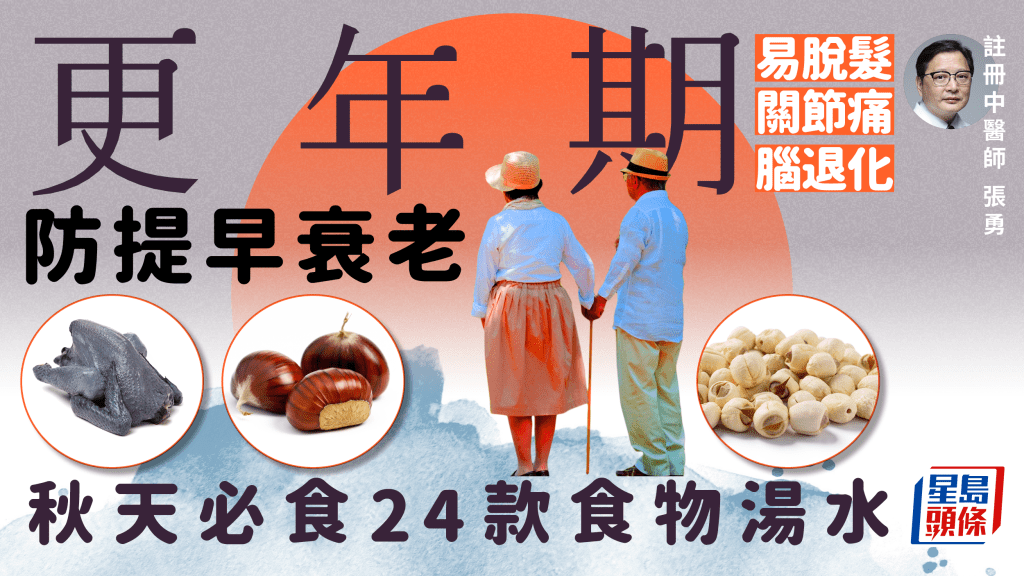 更年期飲食|女性更年期是指在停經(jīng)前后,卵巢功能自旺盛狀態(tài)逐漸衰退及消失,荷爾蒙分泌量下降,引致某些生理和心理轉(zhuǎn)變的一段時期。至于男性,因男性荷爾蒙水平下降,亦有機(jī)會步入更年期,并出現(xiàn)一些跟女性更年期相似的癥狀。注冊中醫(yī)師張勇教如何在秋天著手調(diào)理,預(yù)防提早衰老、紓緩更年期不適的養(yǎng)生方法。