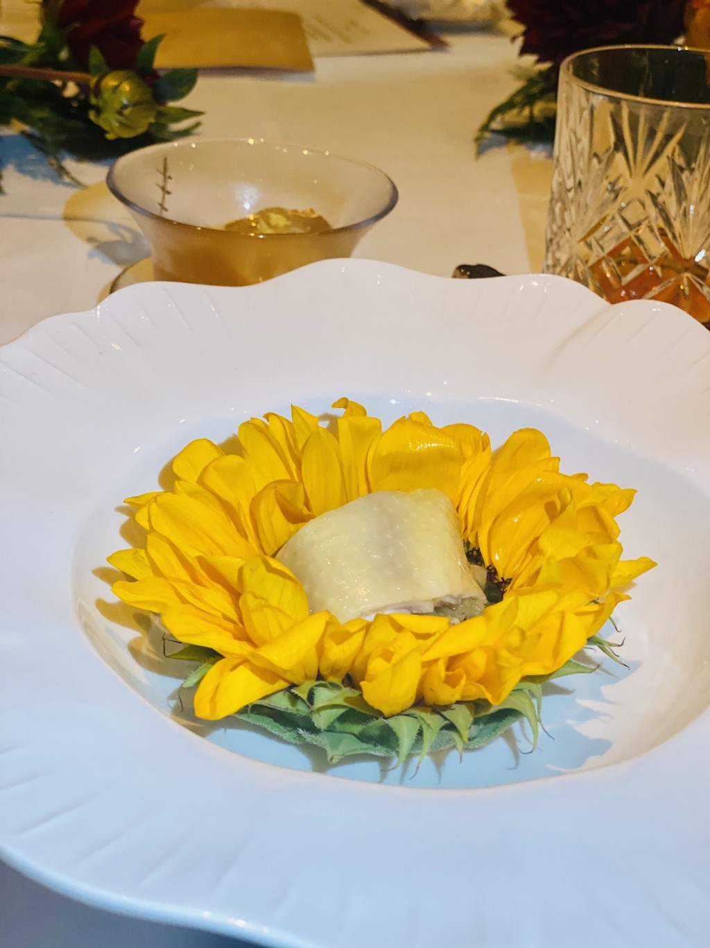 接下來的薑蓉真味葵香雞,由摘下黑珍珠二鉆的廣州柏悅中餐主廚黃遠(yuǎn)獎(jiǎng)操刀,葵香雞沿用135天生長(zhǎng)期,且以新鮮葵花盤、葉、桿作飼料養(yǎng)飼的走地雞入饌,因而得其名。浸熟的葵香雞不但皮爽肉滑、骨脆肉甜,且滿口充盈肉香。嘗罷來一口融合姜蔥風(fēng)味的軒尼詩VSOP特調(diào)雞尾酒,以基酒的香甜,襯托葵香雞的鮮美。