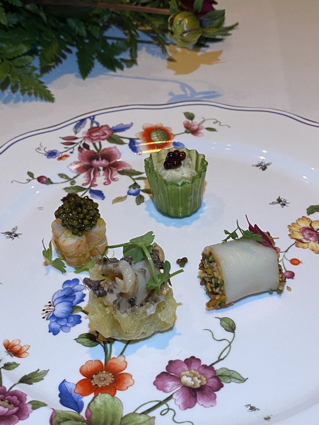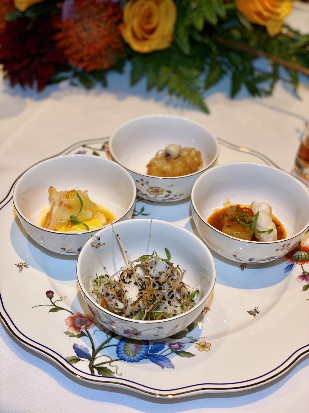 是夜嘗味晚宴,先送上4間酒店聯(lián)手炮制的前菜四小碟,西安凱悅的風(fēng)味葫蘆雞松茸米皮卷微絲辛辣,口感豐富;廣州君悅的意大利黑醋子佐荔枝沙律風(fēng)味清新;廣州柏悅的黃金斑節(jié)蝦肉質(zhì)結(jié)實(shí)富彈性而鮮甜,且以魚子醬點(diǎn)綴多一分貴氣;主場(chǎng)Andaz的干巴菌拌螺片鮮香味美口感Crunchy,三城四味,風(fēng)味各異。