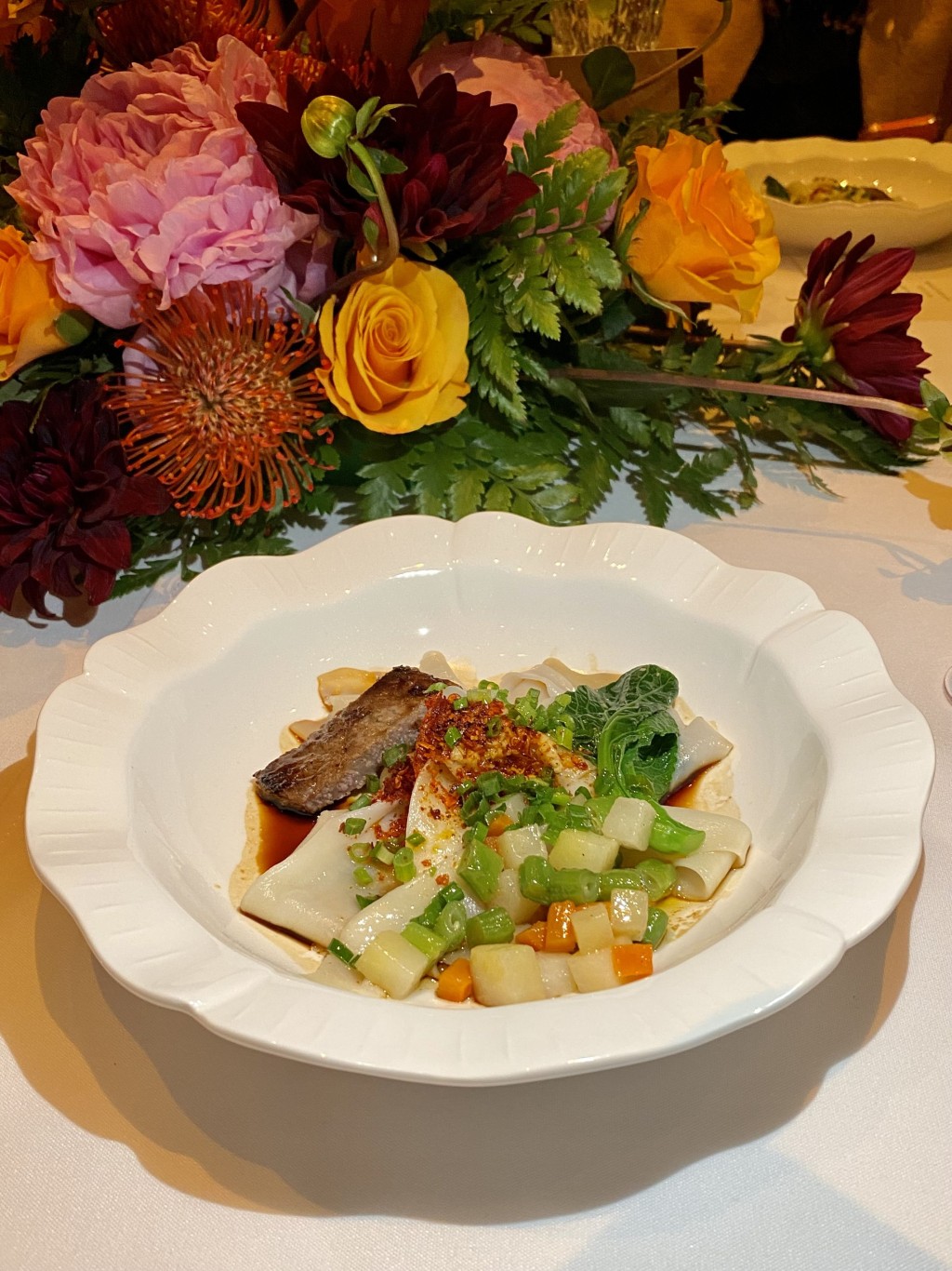 接著是由四位廚師聯(lián)手炮制的龍蝦四重奏,西安凱悅的龍蝦燒綠豆涼粉鑊氣十足,Andaz的香脆蜂巢龍蝦細(xì)滑酥脆,廣州柏悅的黑松露撈起溏心龍蝦口感豐富,攬下黑珍珠一鉆廣州君悅的西施龍蝦佐手指檸檬酸辣醒胃。最后的麵食,名稱寫法繁復(fù)得不能以文字勾劃出,而只能以拼音描述,西安凱悅的家鄉(xiāng)Biang Biang面,制作時(shí)用面粉手打拉成長(zhǎng)寬厚的面條,并發(fā)出“Biang Biang”聲而得其名。