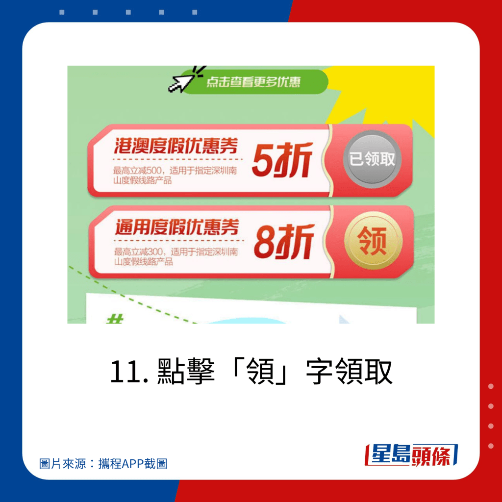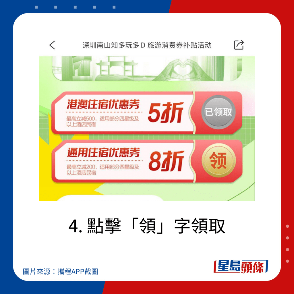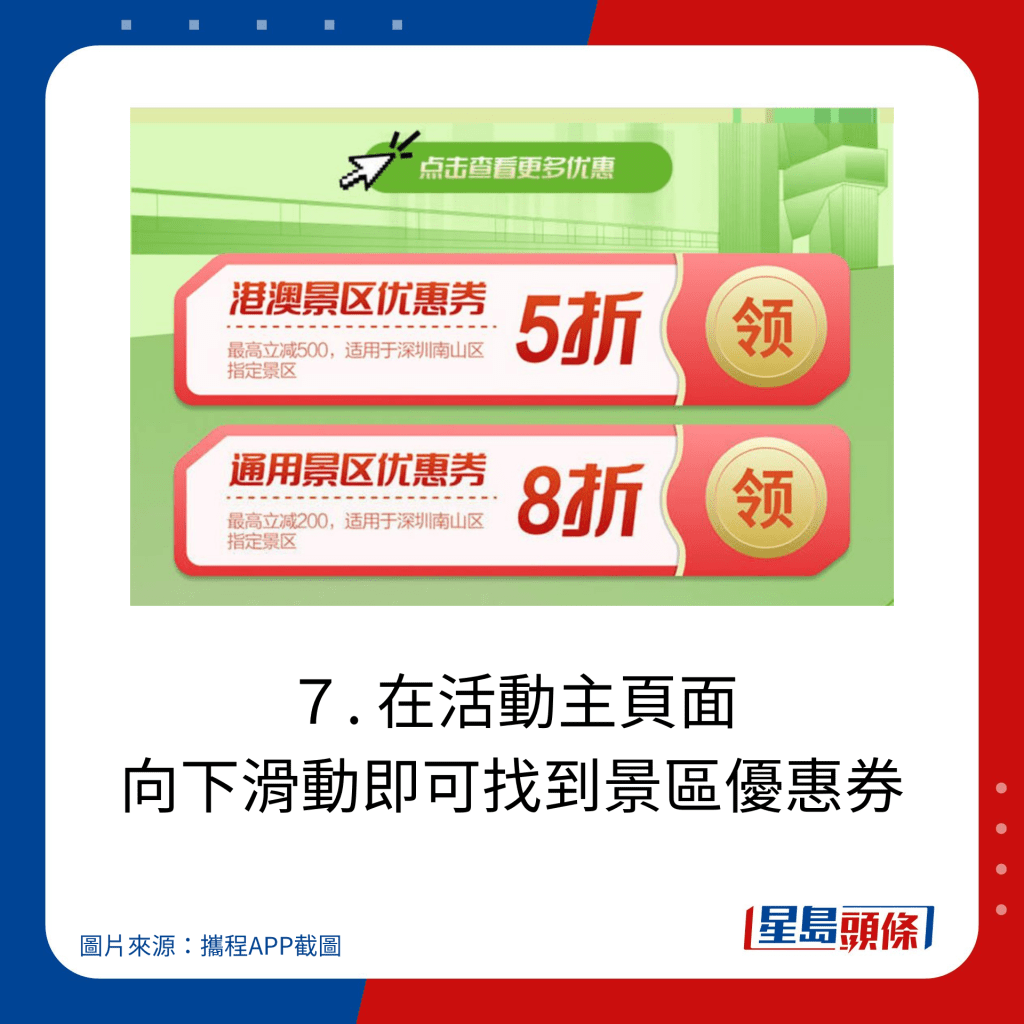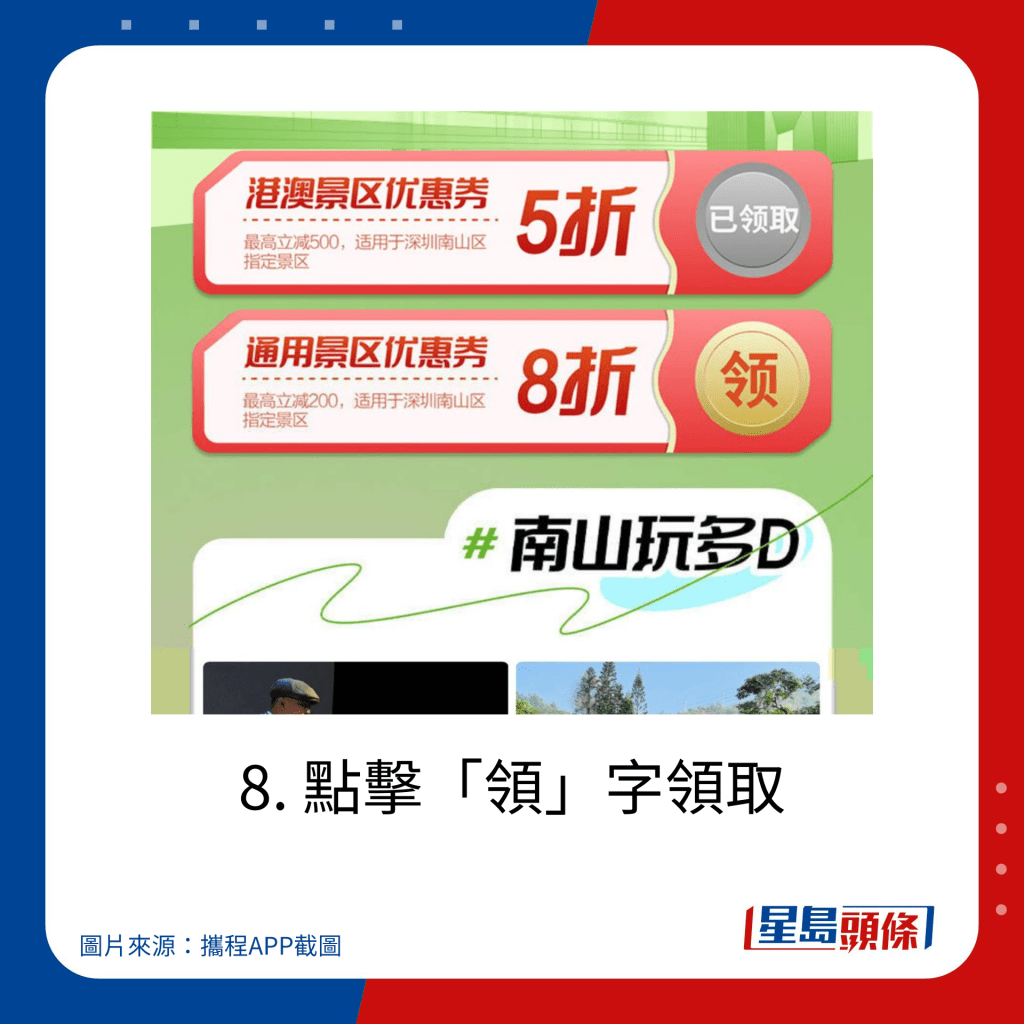 分為“港澳定向度假優(yōu)惠券”及“通用文旅住宿優(yōu)惠券”。“港澳定向度假優(yōu)惠券”向領(lǐng)券時(shí)位于香港及澳門區(qū)域的攜程登錄用戶定向發(fā)放旅游惠民補(bǔ)貼,適用于含1晚深圳市南山區(qū)住宿或景點(diǎn)的指定度假線路產(chǎn)品,折扣高達(dá) 5折優(yōu)惠 ,最高立減 ¥500?!巴ㄓ梦穆米∷迌?yōu)惠券”適用于含1晚深圳市南山區(qū)住宿或景點(diǎn)的指定度假線路產(chǎn)品,折扣為8折,最高立減¥300。