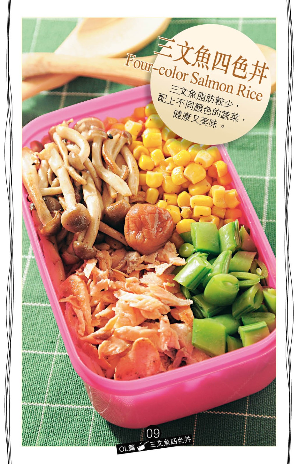 顏色繽紛的美食可增加食欲,好像備有4種食材的三文魚四色丼便當(dāng),便豐富又悅目。 將三文魚柳煎熟及拆肉。 本菇撕成細(xì)條,四季豆撕去兩端及筋,用加了鹽和油的滾水灼熟再切粒。 起油鑊分別炒香粟米粒、本菇,各以鹽及胡椒粉調(diào)味。 在便當(dāng)飯盒中加入白飯,分別放上三文魚、四季豆、粟米粒、本菇即完成。