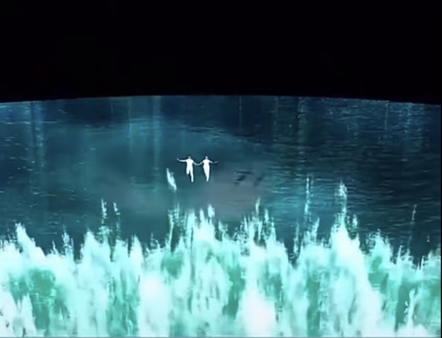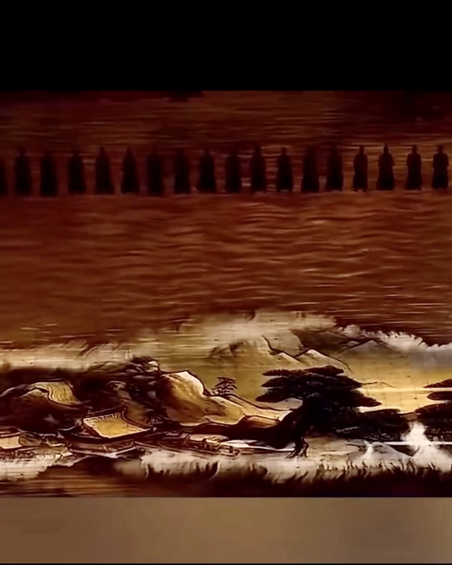 現(xiàn)場(chǎng)通過地上屏幕和立體透視網(wǎng)幕的配合,將錢塘江和青山綠水搬到舞臺(tái)。