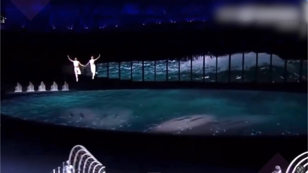 ▲現(xiàn)場(chǎng)通過地上屏幕和立體透視網(wǎng)幕的配合,將錢塘江和青山綠水搬到舞臺(tái)。
