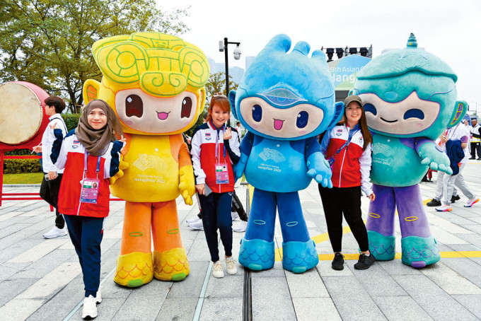 ▲馬來(lái)西亞選手同亞運(yùn)吉祥物“琮琮”、“宸宸”、“蓮蓮”合影。