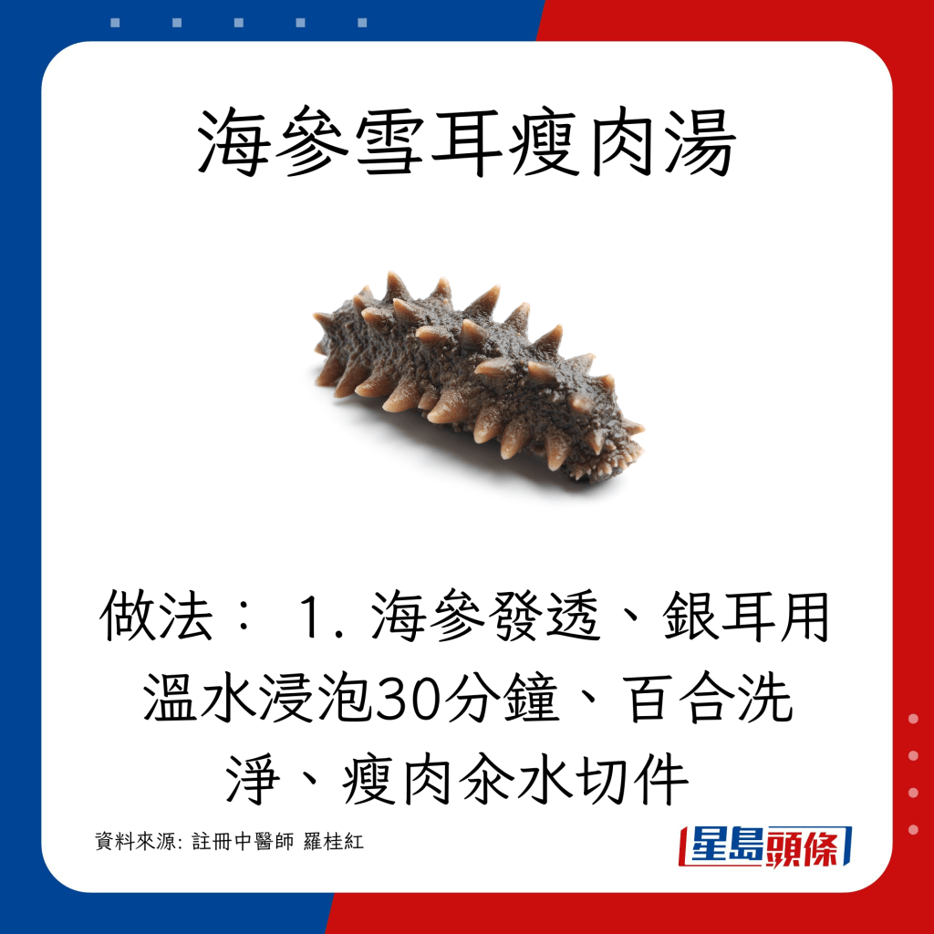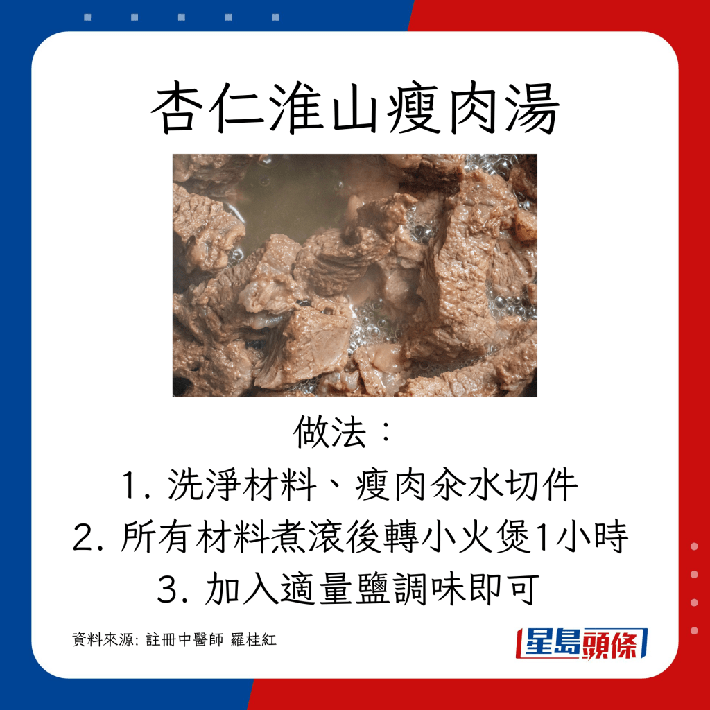 杏仁淮山瘦肉湯、海參銀耳瘦肉湯,功效、材料、做法如下: