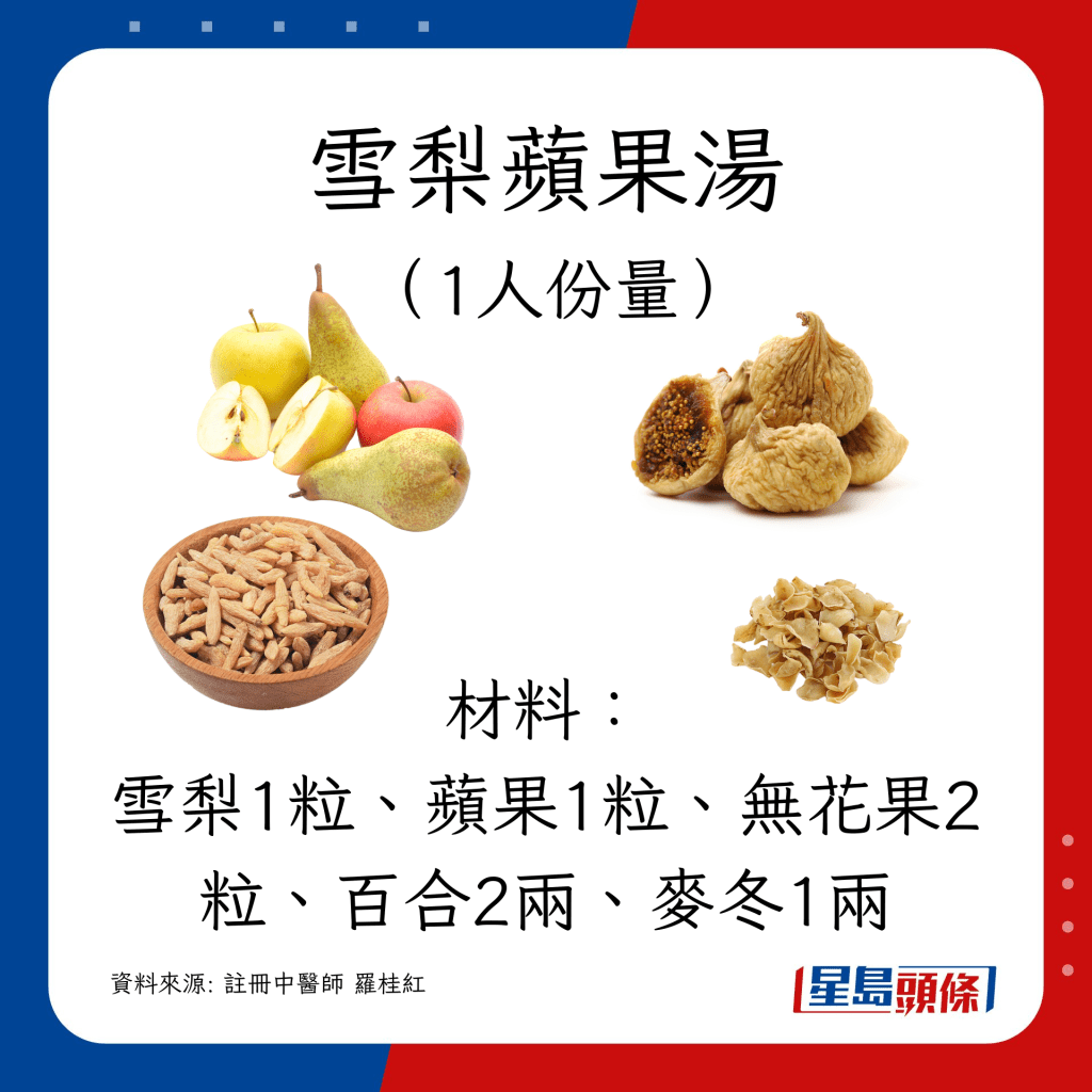 沙參雪耳百合瘦肉湯、雪梨蘋果湯,功效、材料、做法如下: