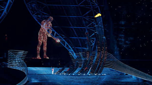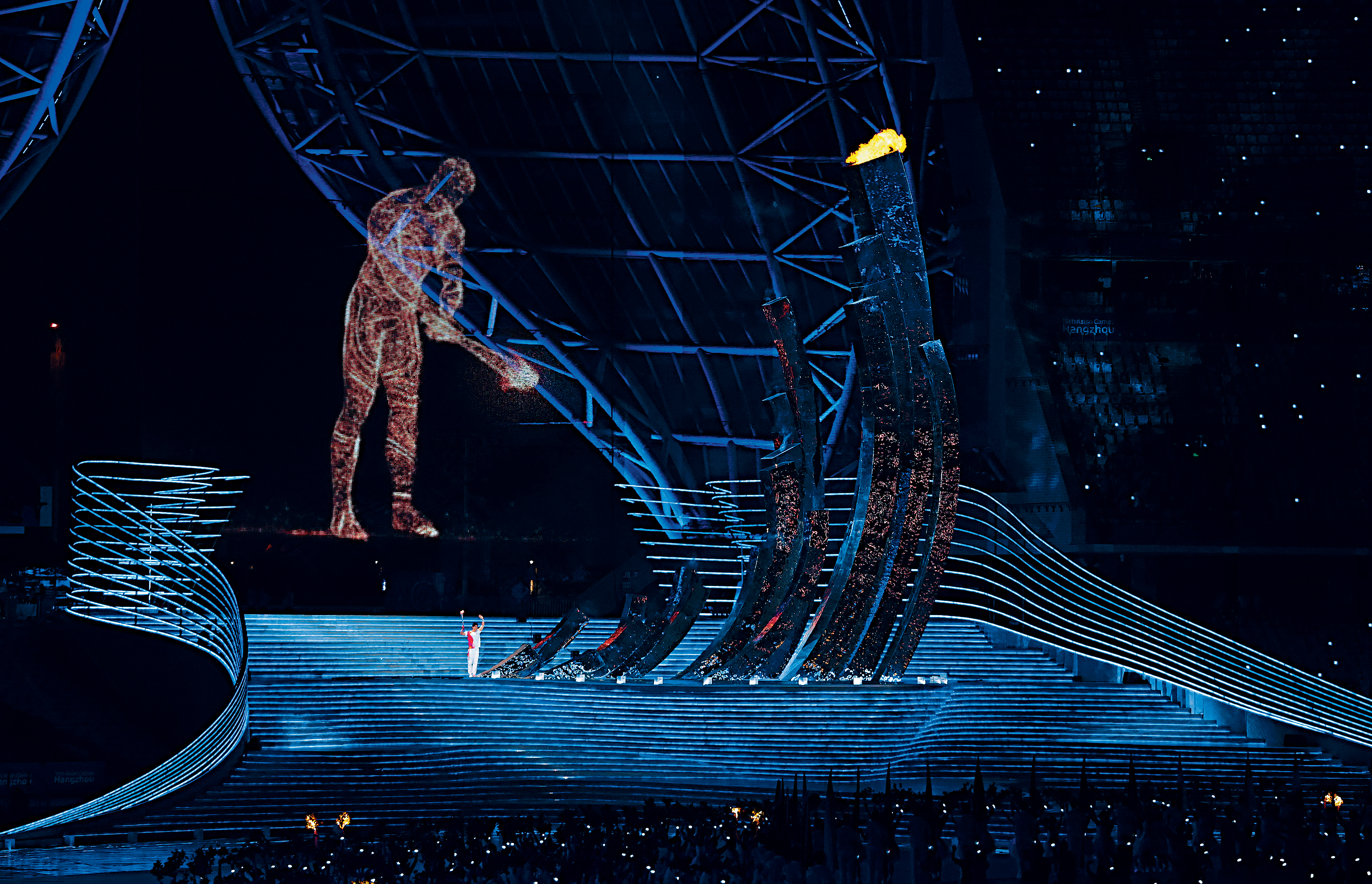 亞運(yùn)史上首個(gè)“數(shù)實(shí)融合”主火炬點(diǎn)燃儀式是開幕式的最大亮點(diǎn)。由上億民眾參與“在線點(diǎn)火”匯聚而成的“數(shù)碼巨人”,穿越杭州城踏浪前來(lái),跨進(jìn)奧體中心體育場(chǎng)“大蓮花”,與現(xiàn)場(chǎng)火炬手奧運(yùn)游泳冠軍汪順共同點(diǎn)燃火炬塔。今屆亦打破以往大型運(yùn)動(dòng)會(huì)慣例,現(xiàn)場(chǎng)改燃起電子煙花,體現(xiàn)綠色環(huán)保理念。