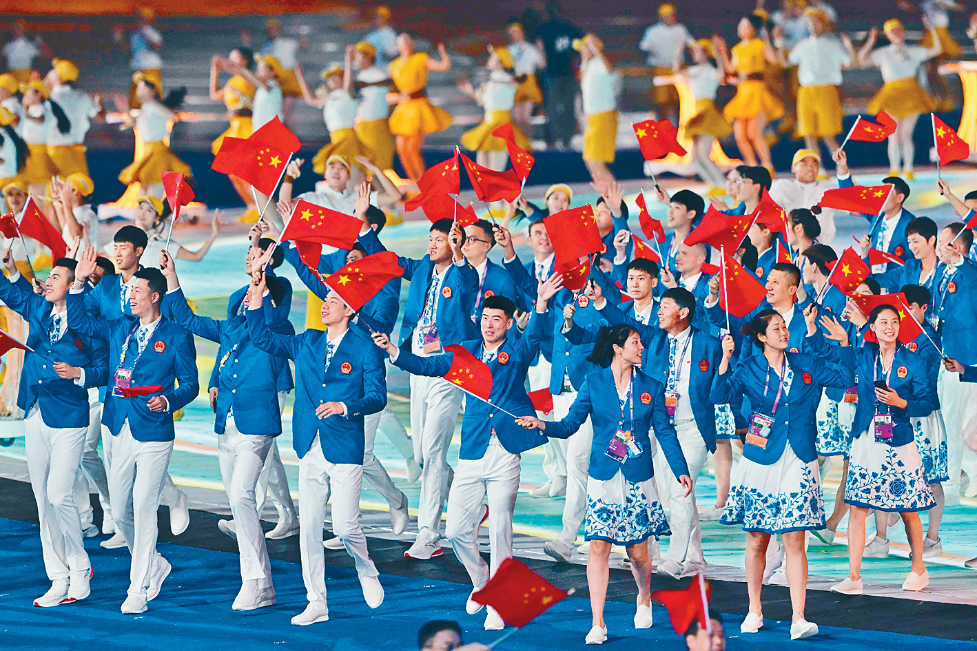 延期1年的杭州亞運(yùn),讓來(lái)自45個(gè)國(guó)家和地區(qū)的12000多名亞洲運(yùn)動(dòng)員,再有機(jī)會(huì)同場(chǎng)競(jìng)技,彼此交流。伴隨躍動(dòng)的《我們的亞細(xì)亞》背景音樂(lè),在志愿者的夾道歡迎下,選手們逐一進(jìn)場(chǎng)。他們一手揮舞旗幟,一手高舉手機(jī),記錄難忘時(shí)刻。中國(guó)體育代表團(tuán)886名運(yùn)動(dòng)員在世界游泳冠軍覃海洋、女籃隊(duì)長(zhǎng)楊力維兩位旗手帶領(lǐng)下亮相,引來(lái)全場(chǎng)歡呼。