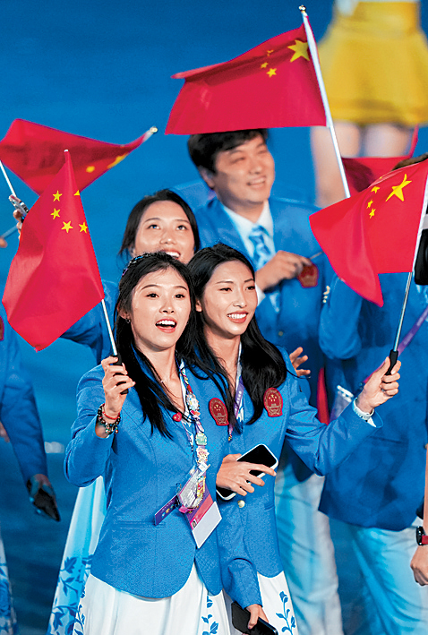 ▲有中國(guó)“跨欄美女”之稱的吳艷妮揮舞國(guó)旗進(jìn)場(chǎng)。中新社