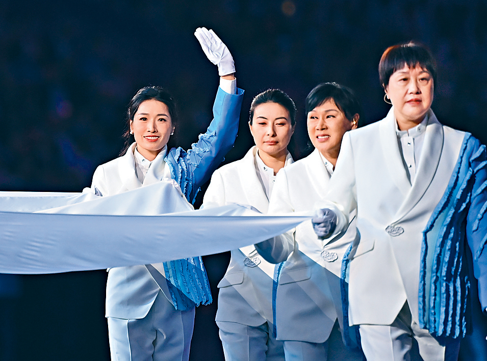 ▲8位持旗手帶領(lǐng)亞奧理事會(huì)會(huì)旗入場(chǎng),包括跳水皇后郭晶晶(左二)及一代蛙后羅雪娟(左一)。