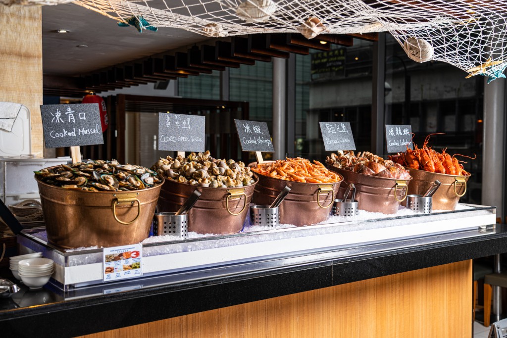 至于自助晚餐美食推介除了有一系列凍海鮮,如生蠔、翡翠螺、面包蟹、生蠔、凍龍蝦,亦提供刺身、火炙壽司、天婦羅,還有蟹肉海鮮炒飯、蒜蓉粉絲鮑魚、香辣胡椒龍蝦鉗、炒泰式咖哩蝦等,周末更有特別限定燒有骨肉眼扒!