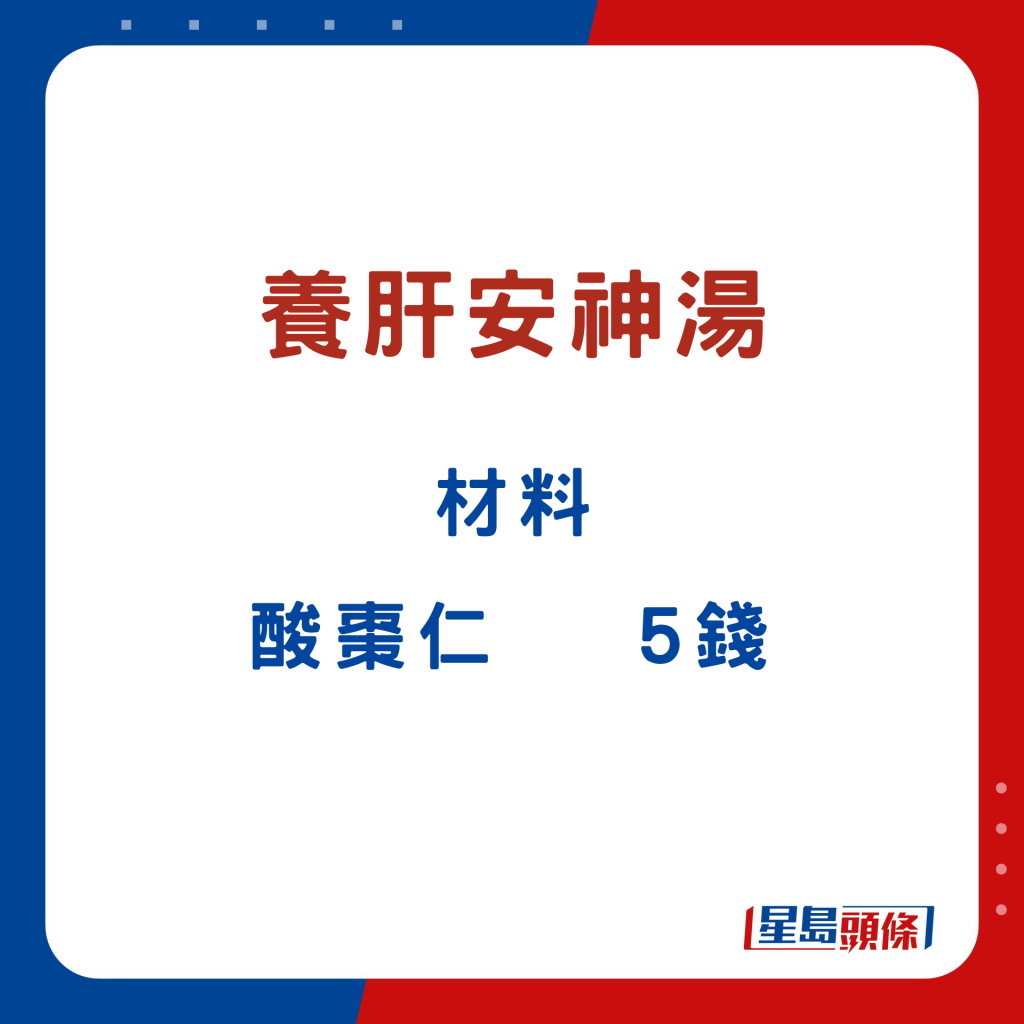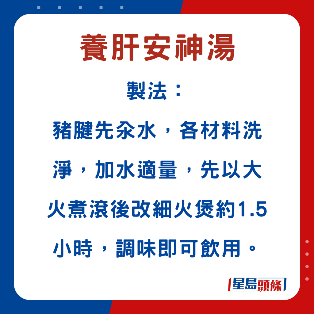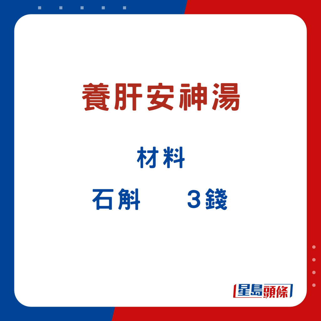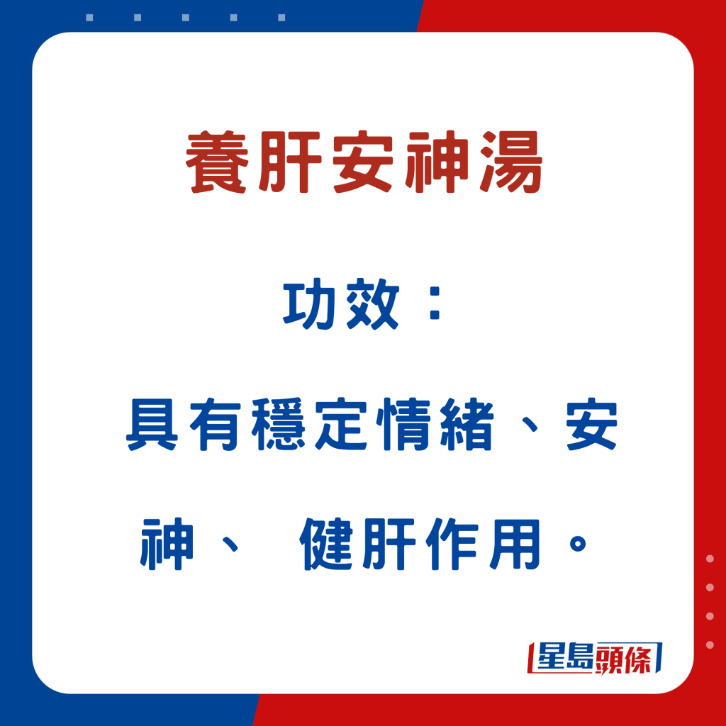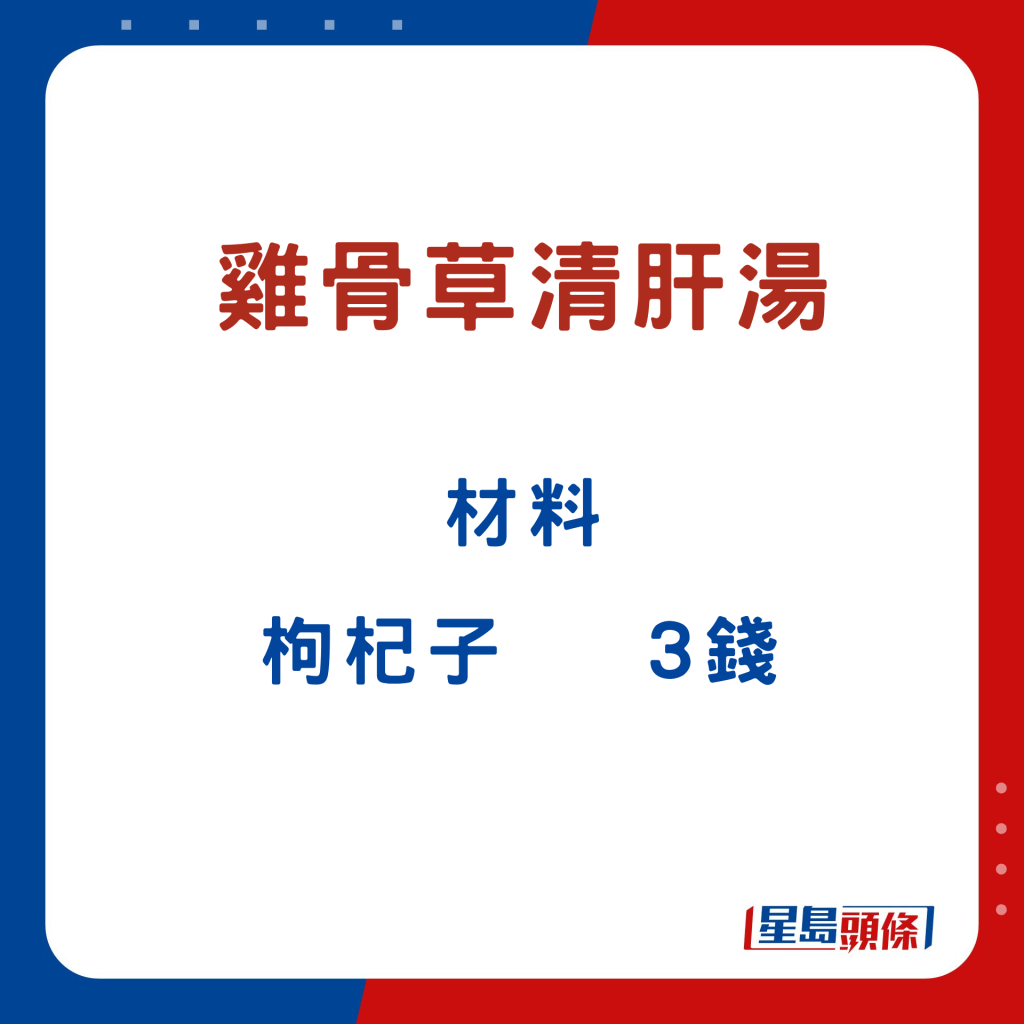至于不愛(ài)吃糖水的人士,可以選擇以下2款湯水,同樣具有降燥、清肝火的功效,當(dāng)中包括雞骨草清肝湯、養(yǎng)肝安神湯,制法如下: