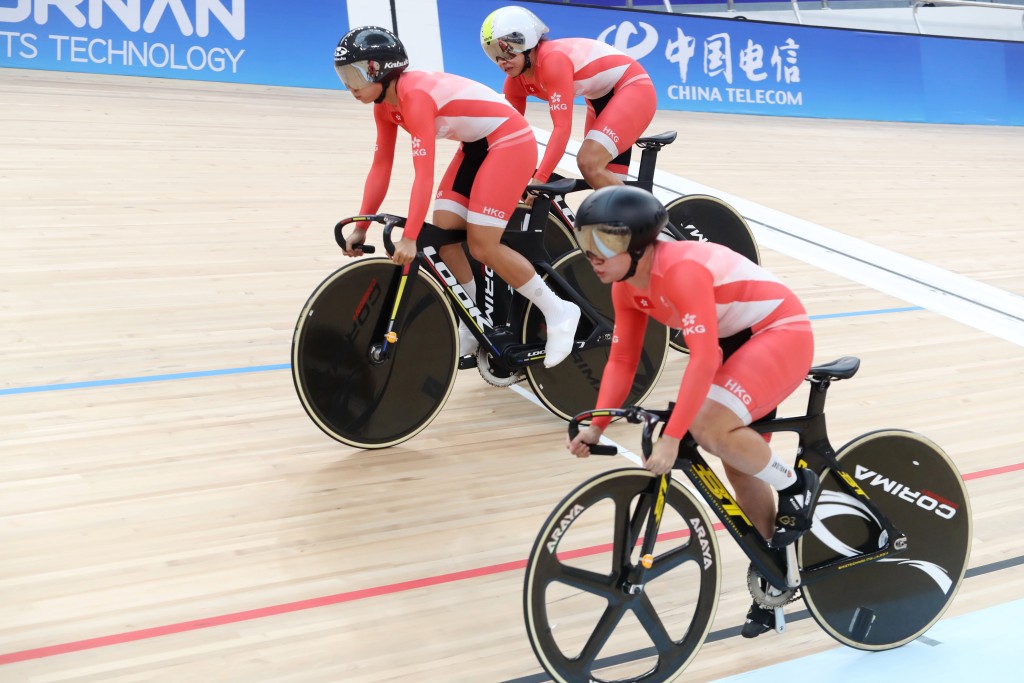 李思穎、楊倩玉、梁寶儀及梁穎儀聯(lián)手出戰(zhàn)女子團(tuán)體追逐賽,周二資格賽踩出4分34秒009 ,排名第4,晉級之后不敵日本隊,周三下午轉(zhuǎn)戰(zhàn)銅牌賽斗韓國。4位女車手在銅牌戰(zhàn)發(fā)揮后勁,以4分28秒761沖線,爆冷擊敗4分30秒181的韓國,歷史性勇奪此項目銅牌。這面獎牌,也是單車隊在本屆亞運第一塊牌。