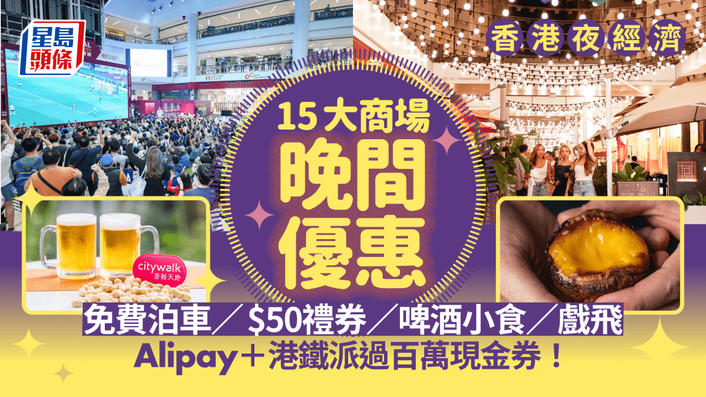 香港夜經(jīng)濟(jì)|15大商場(chǎng)晚間優(yōu)惠,免費(fèi)泊車/$50禮券/Alipay+港鐵派過百萬現(xiàn)金券