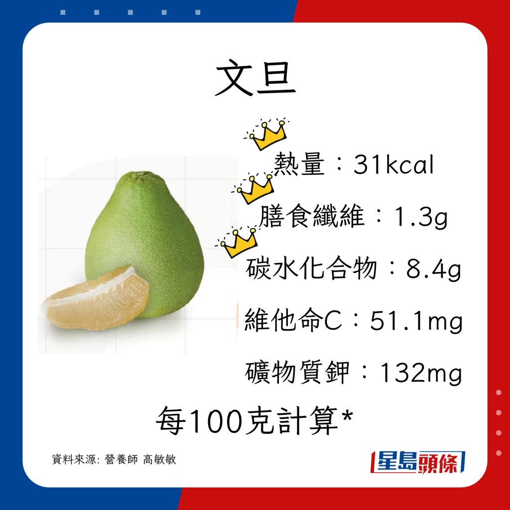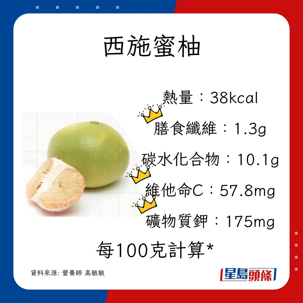 白柚、紅柚(又稱紅肉西柚) 或蜜柚:約3瓣為100克