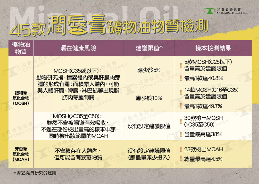 消委會指,在產(chǎn)品成分表上看到有礦物油成分,例如礦脂(petrolatum)、礦物油、聚乙烯(polyethylene)、聚丁烯(polybutene)等,該成分更是列于成分列表中的頭3位的話,該潤唇膏較大機會檢出含量MOSH,而且含量較高;有大部分會同時被檢出含有MOAH,所以要盡量避免選用含這些成分的潤唇膏。