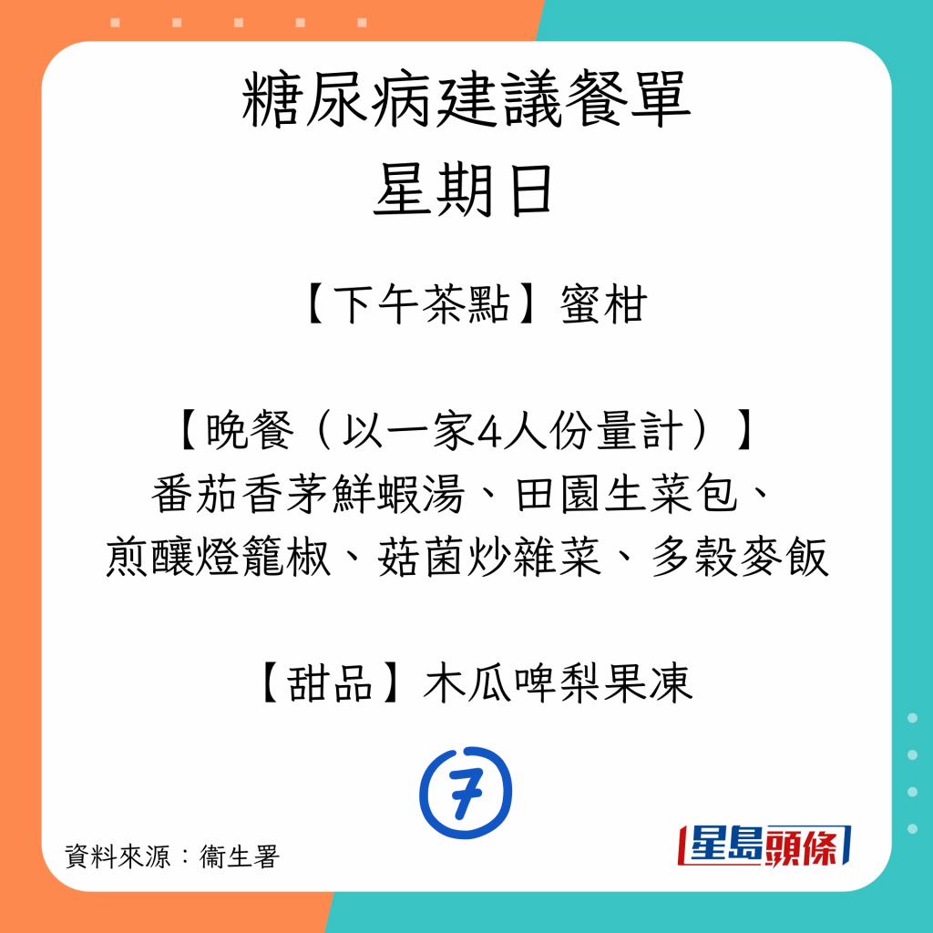 患糖尿病后要戒口嗎? 吃甚么可避免病情惡化? 本港衛(wèi)生署建議,糖尿病患者可以參考以下餐單,準備7日的食物份量: