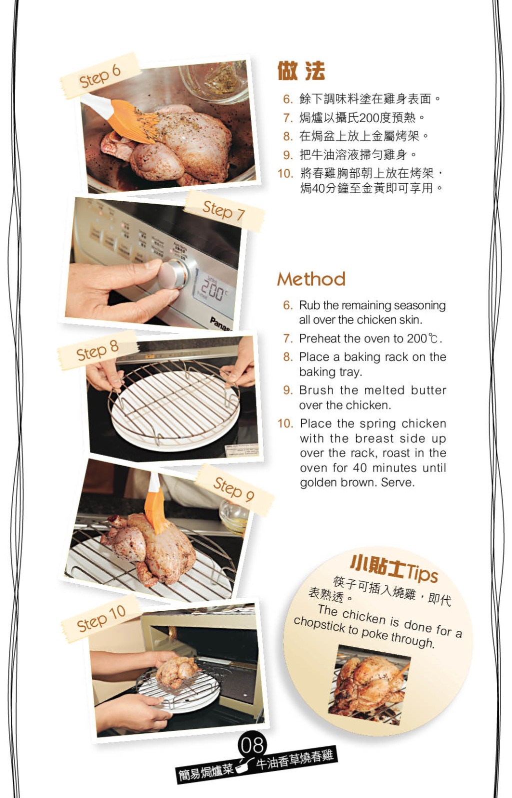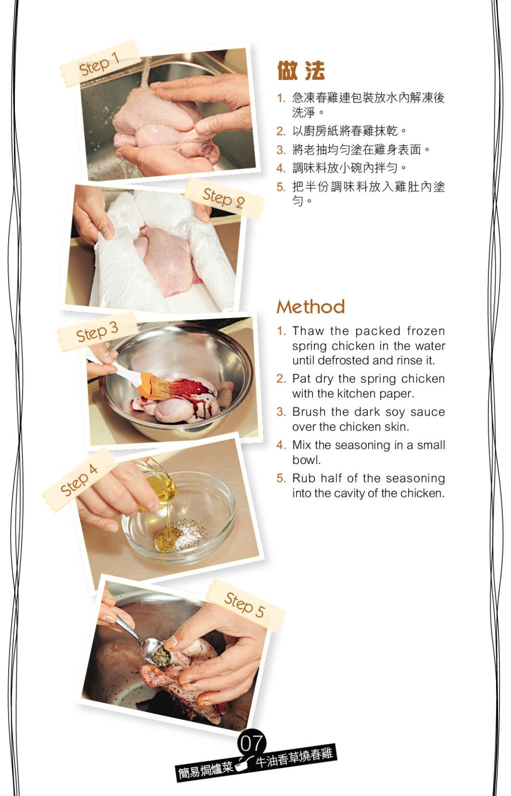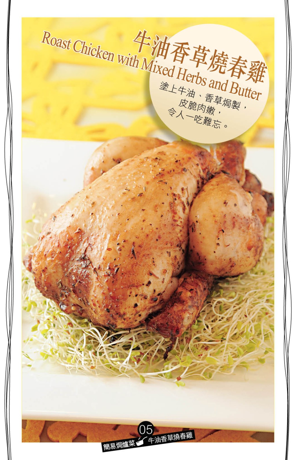 掌握食譜秘訣,就可做出皮脆肉嫩的牛油香草燒春雞。重點(diǎn)是清洗春雞后,要徹底抹干,才能焗至香脆。先在干身的春雞涂上老抽,將香草、鹽、橄欖油及胡椒拌勻,抹在雞皮及雞腔,再置于架上放入焗爐烤熟。