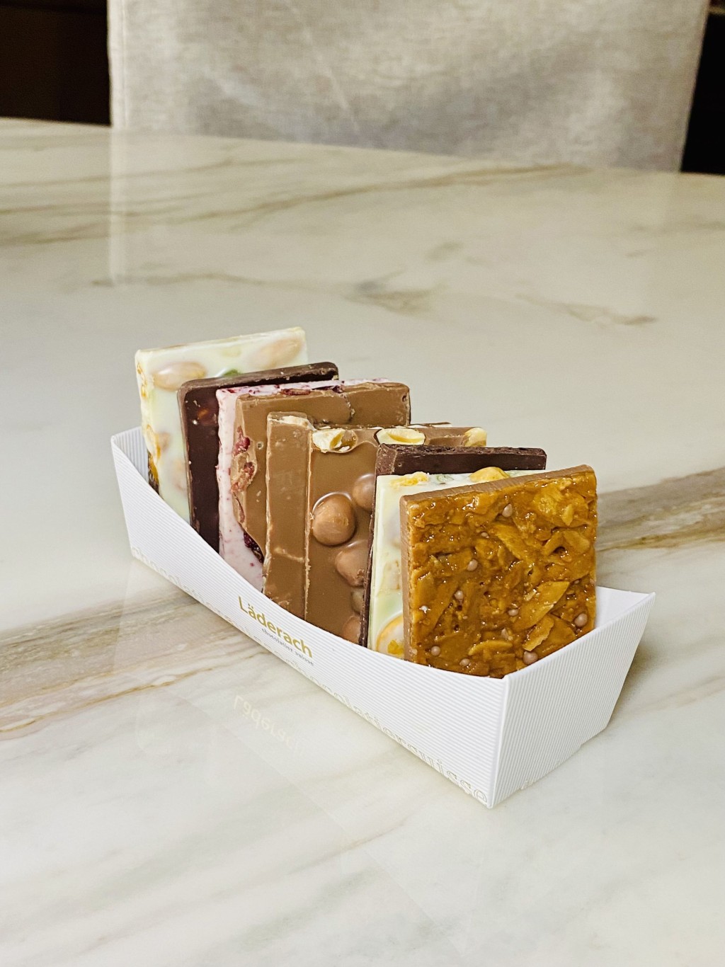 飯后不忘走到商場地庫,前往歷史悠久的瑞士Laderach朱古力店選購久違的朱古力品牌。店中Pralines及Truffles等朱古力一應俱全,可是Fifi鐘情FrischSchoggi果仁朱古力塊的味道口感,因而選了集杏仁黑朱古力塊、紅莓牛奶朱古力塊等十多款不同口味于一身的FrischSchoggi Boat雜錦朱古力塊(199元人民幣/330克),回港每日一塊,以之伴茶,樂透半天。