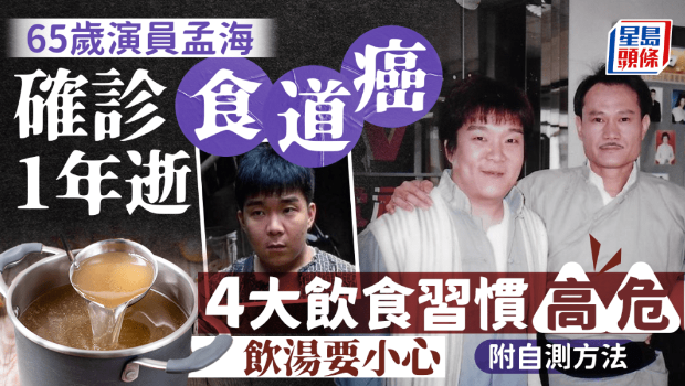 資深演員孟海(原名:孟景海)昨日(10日)凌晨傳出因食道癌病逝,終年65歲。據(jù)了解,孟海去年患上食道癌,雖然曾努力接受治療抗癌,但一年后仍不敵病魔離世。食道癌是香港第10大致命癌癥,有醫(yī)生指,常吃4種食物會增加患食道癌的風(fēng)險(xiǎn),包括不少人常喝的湯水,并教自測食道癌方法。