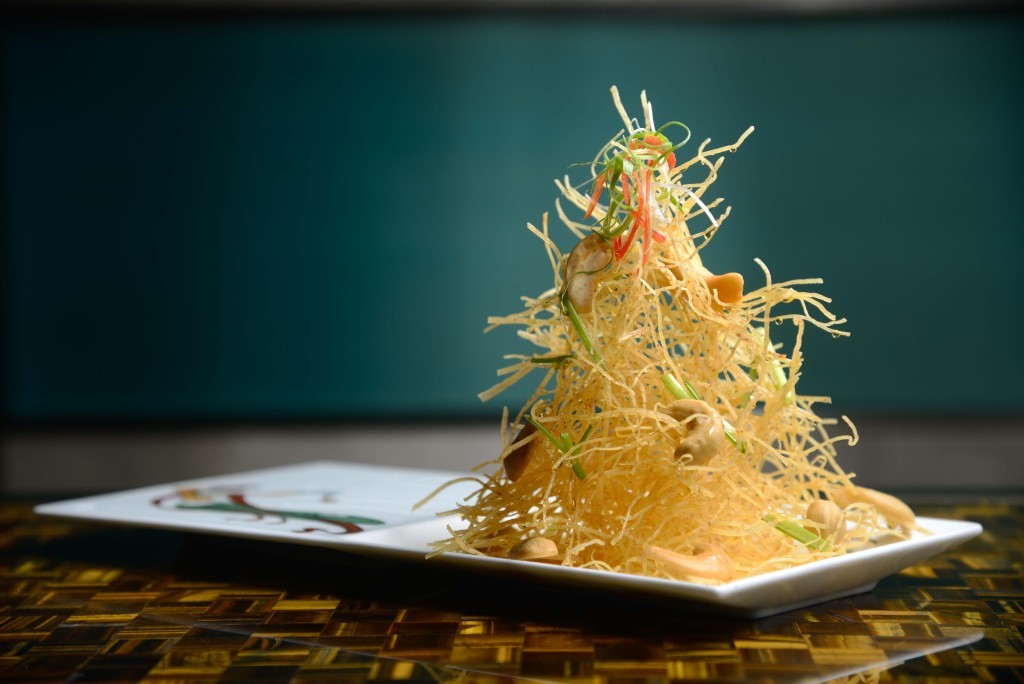 金絲脆腰果$110,金絲即炸脆的芋絲,淋上白醋混合蜜糖的醬汁,酸甜中和了油膩感。