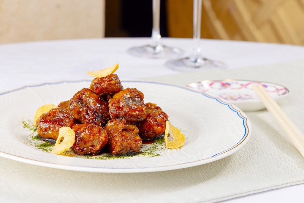 陳師傅最近與上海柏悅酒店悅軒的中餐行政總廚楊超師傅聯(lián)手,推出多款江南美饌及時令大閘蟹菜式(供應(yīng)期10月17日至11月14日),像是脆皮風味松坂肉、楊師傅油爆河蝦與黑椒雪花牛肉等。 經(jīng)過改良的脆皮風味松坂肉,是以嫩滑的豬面肉替代傳統(tǒng)燻魚,豬面肉炸后酥香脆口,亦有豬肉的鮮美,配合特調(diào)的酸甜辣汁,層次分明惹味。