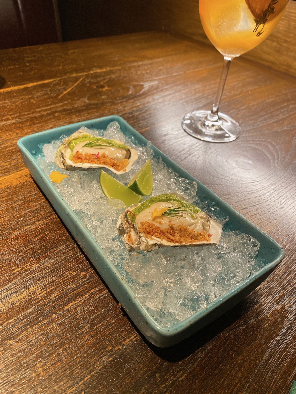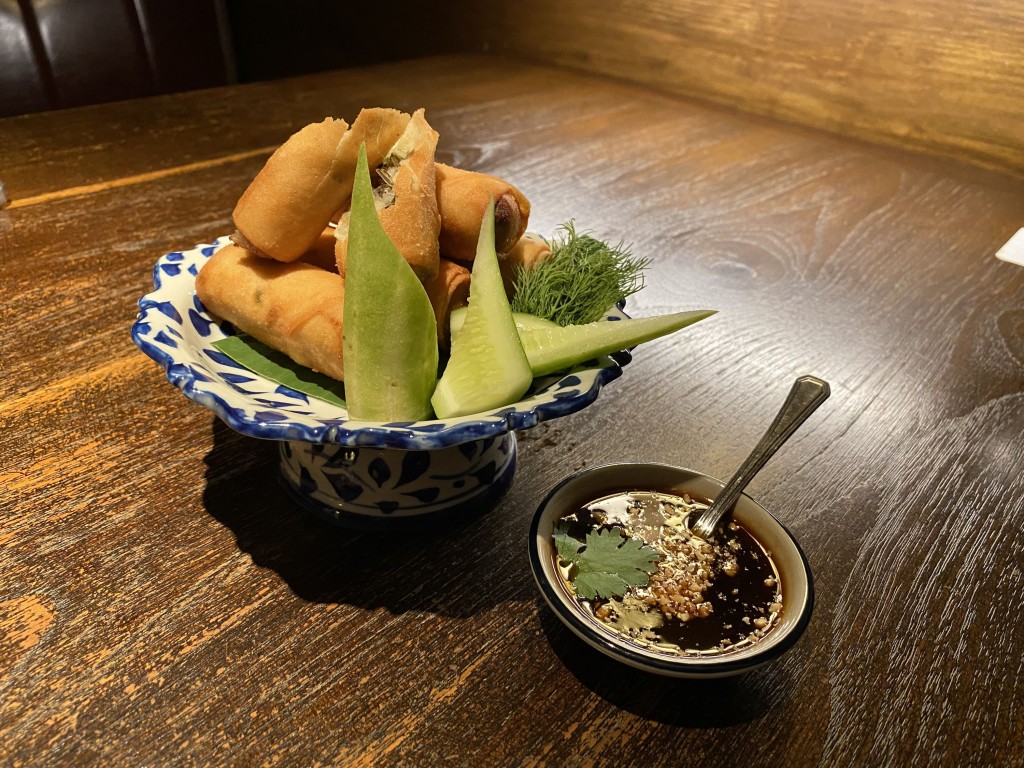 接下來頭盤泰國生蠔(70泰銖/約$18/只),自身鮮美口感Creamy,用時醮上隨附的香辣野生杏仁汁提鮮。至于炸得金黃香脆的泰式純素春卷(180泰銖/約$45),外皮雖然較熟悉的港式春卷皮厚,但不失香口惹味。