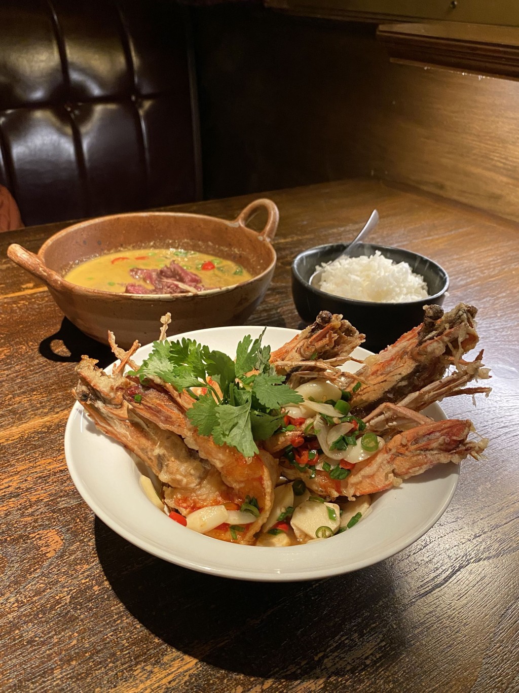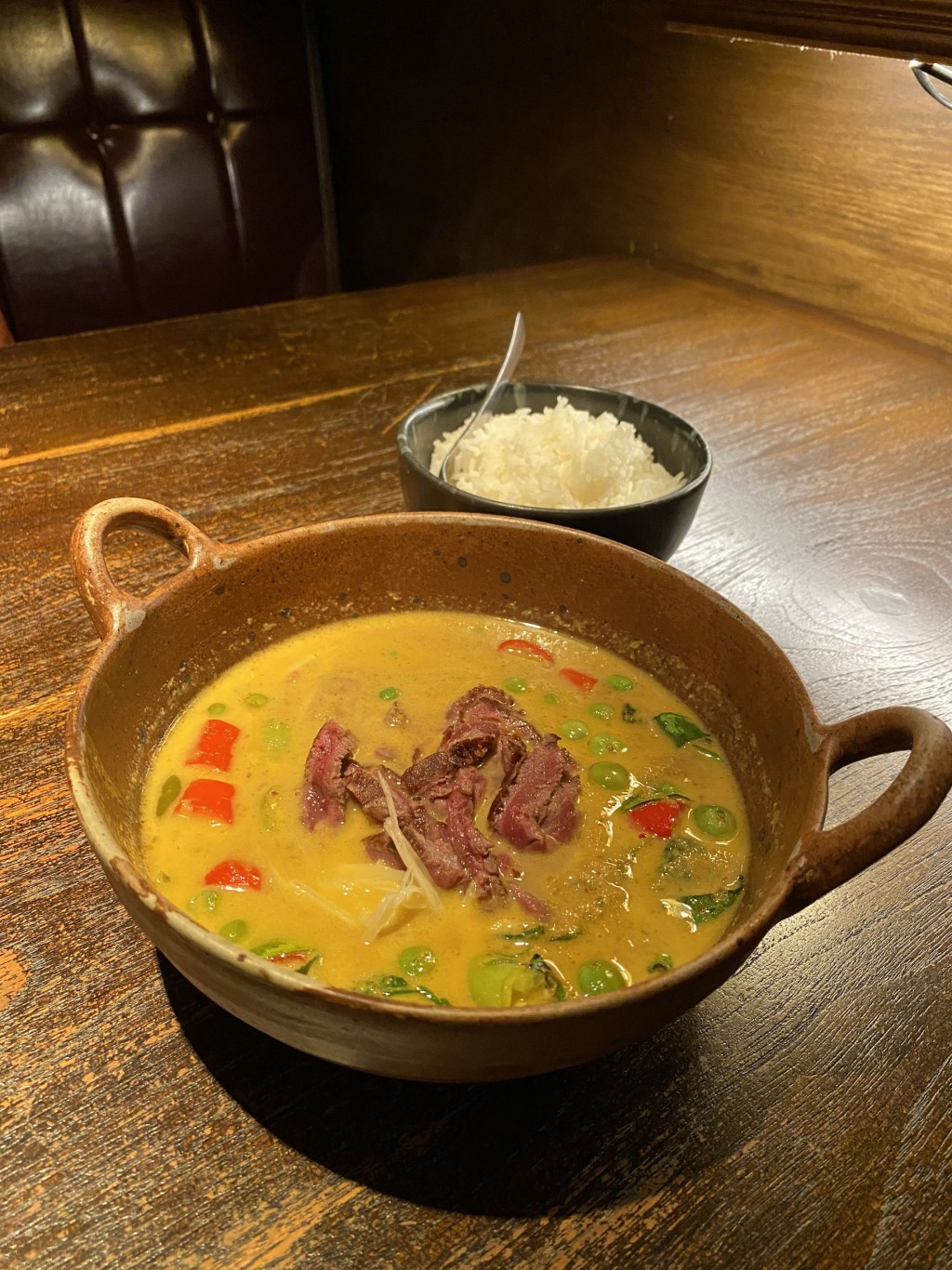 接著主菜香煎虎蝦(540泰銖/約$140)鮮美爽彈,配合香蒜辣椒魚露提鮮。至于Rawang Curry Thai Wagyu Beef(350泰銖/約$90)是以質(zhì)感濃郁豐盛的椰漿為基調(diào),配合紅綠辣椒、香料和姜黃蓉炮制的古法咖喱,泰國和牛脂肪在慢煮過程與椰漿融合,因而甜美細(xì)滑且肉汁豐盛??о⑿料烫鸲浇z絲草澀,用時佐以白米飯,樸實窩心。