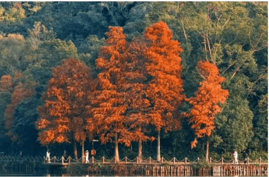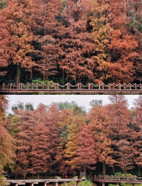 踏入12月底至1月,深圳各地會(huì)出現(xiàn)更多紅葉美景。在仙湖植物園里,一大片橙紅色的落羽杉樹和湖景相映成趣,美得像油畫;在洪湖公園,有延綿近2公里的落葉杉木林,是華南地區(qū)種植規(guī)模最大的落葉杉區(qū)域,園內(nèi)的伏龍橋更是落葉杉遠(yuǎn)景的最佳觀賞地之一,可以將公園大片落葉杉景觀盡收眼底。