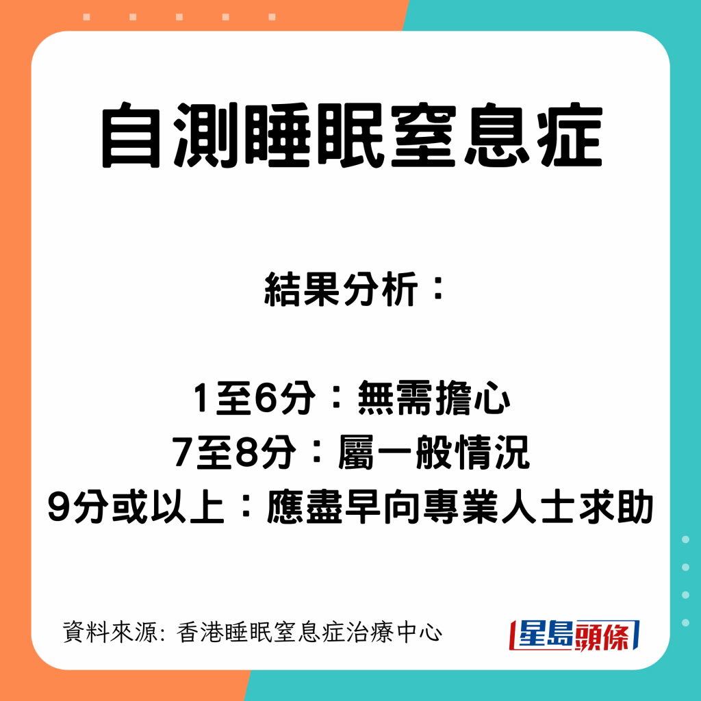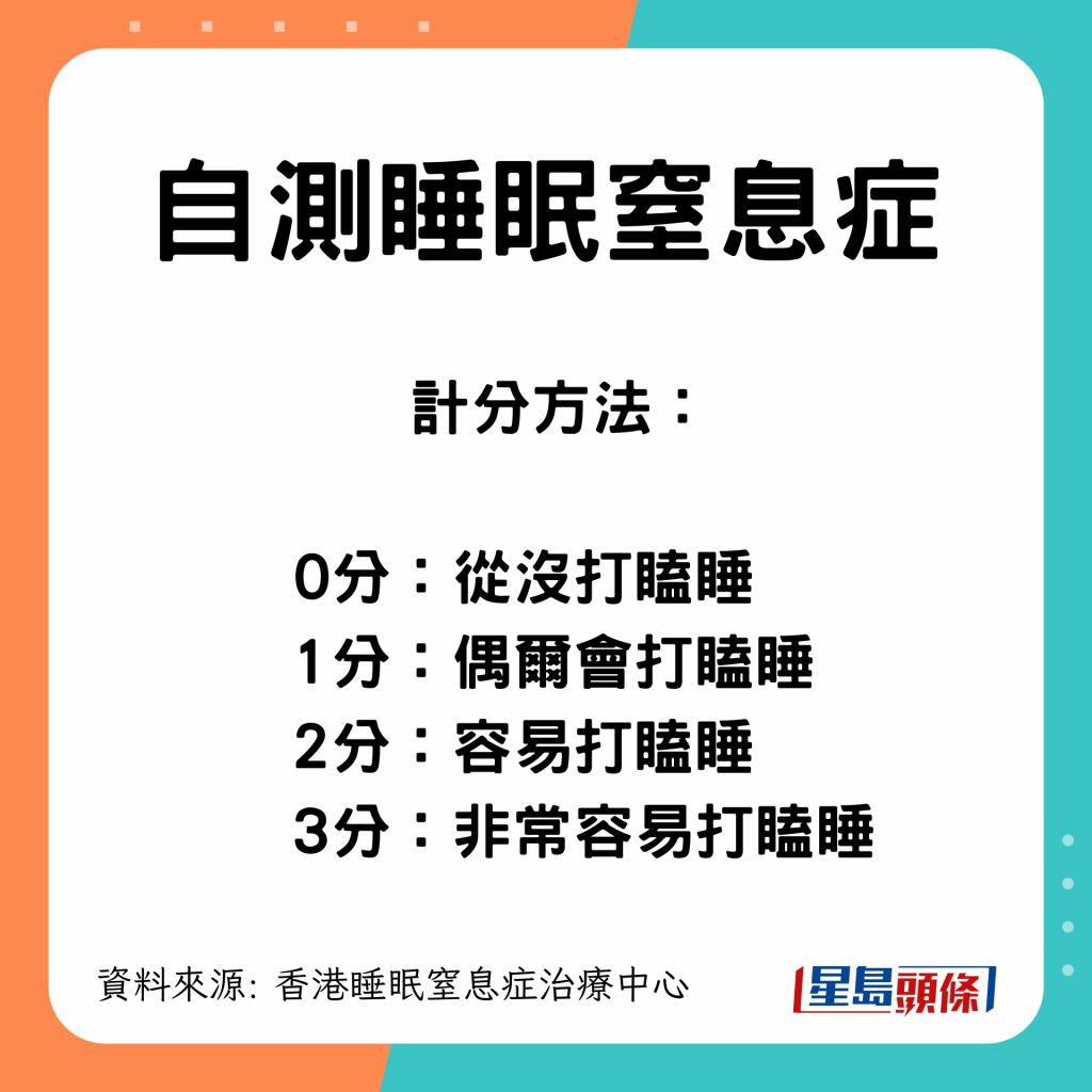 鼻鼾聲大是患上睡眠窒息癥的警號(hào)?根據(jù)香港睡眠窒息癥治療中心資料,要得知有否患上睡眠窒息癥,可用以下方法進(jìn)行測(cè)試。