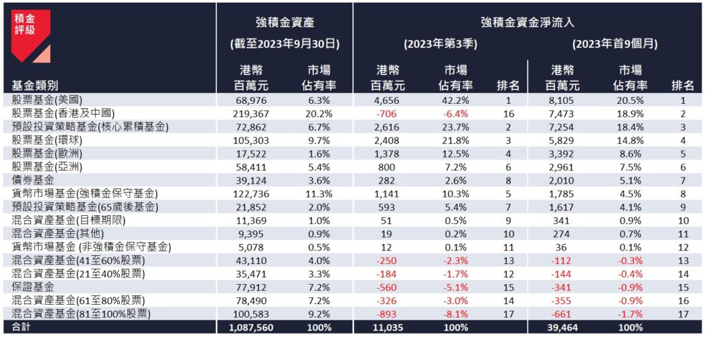 2023 年第 3 季及首 9 個月的強積金資產(chǎn)類別資金流。