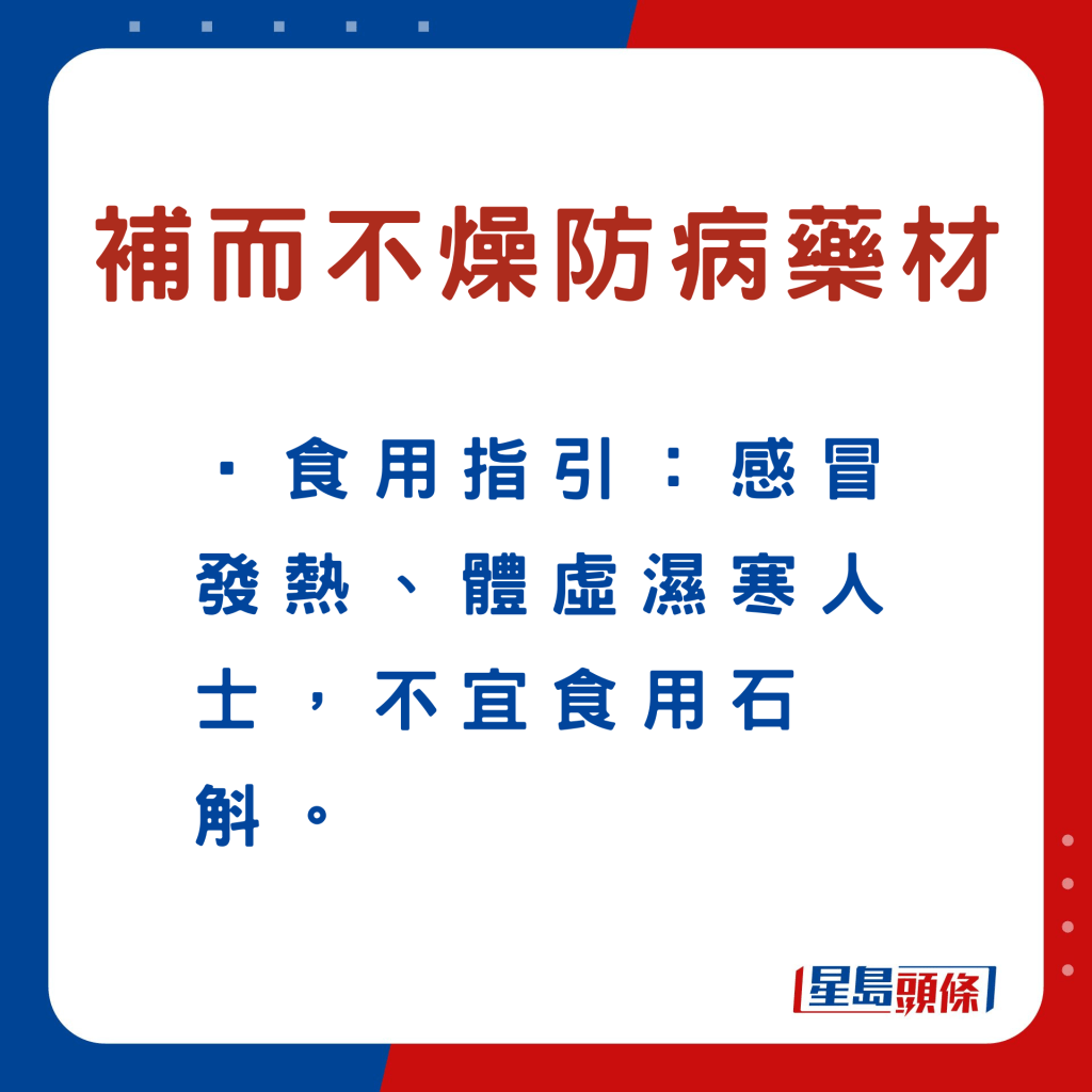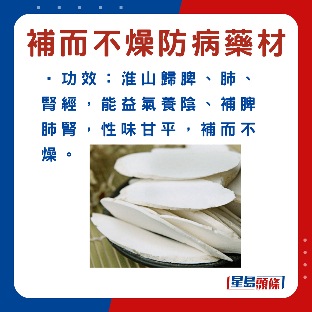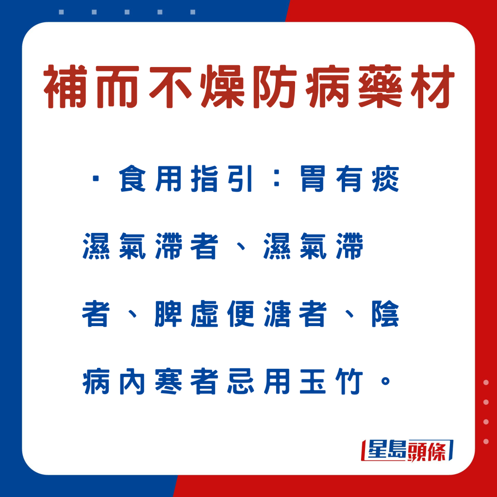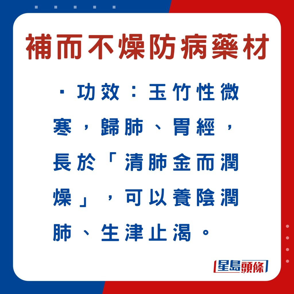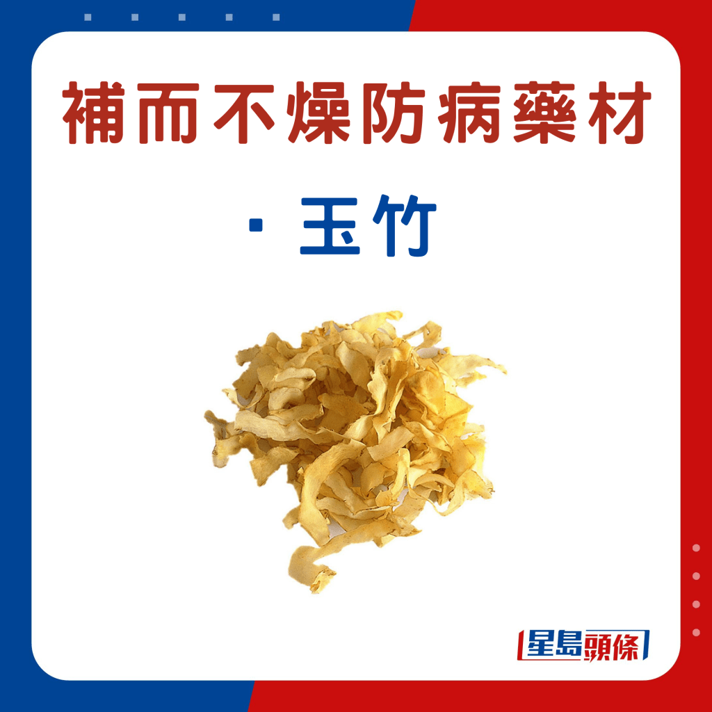 另外,以下6款中藥材,例如玉竹等,符合深秋“平補(bǔ)”原則,同時(shí)有助加強(qiáng)脾胃、肺腎、肝臟等功能,以增強(qiáng)人體抵抗力,有利防病。食物例子、功效及食用宜忌如下: