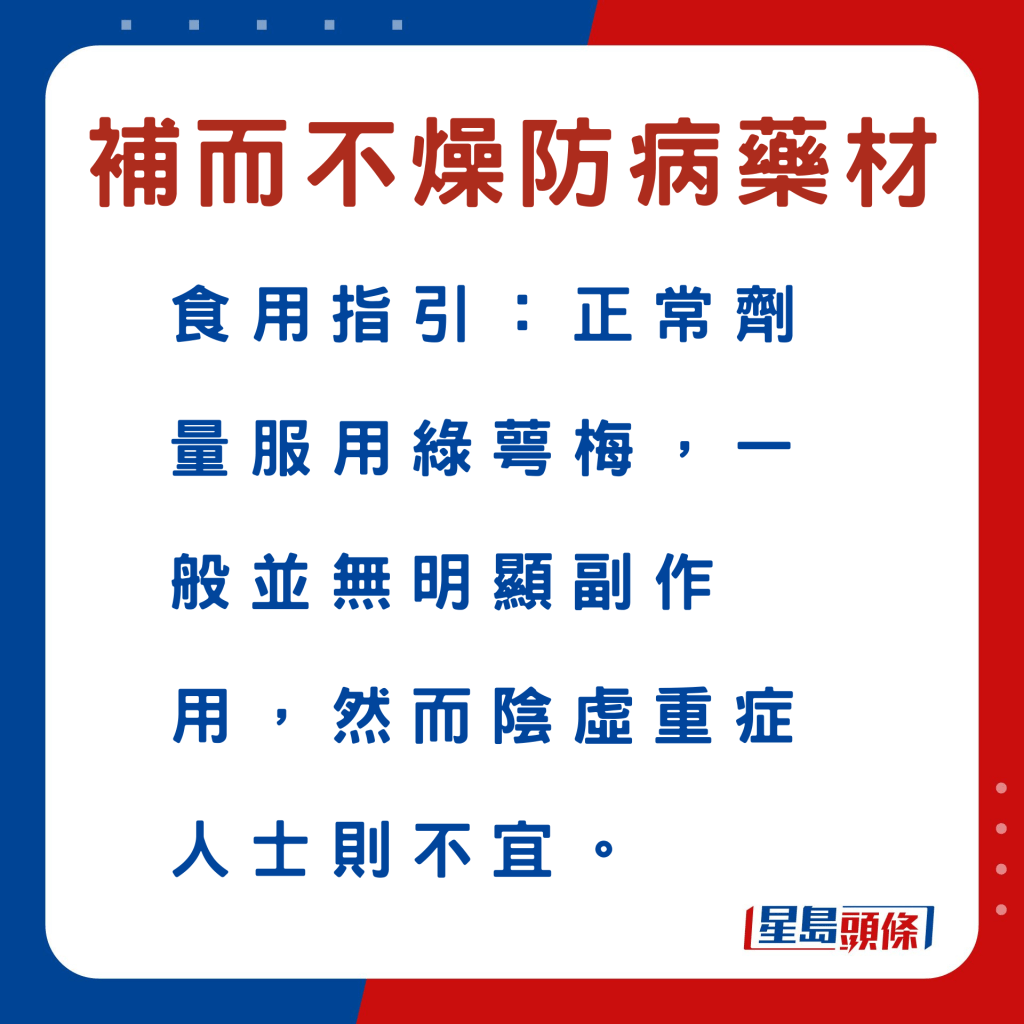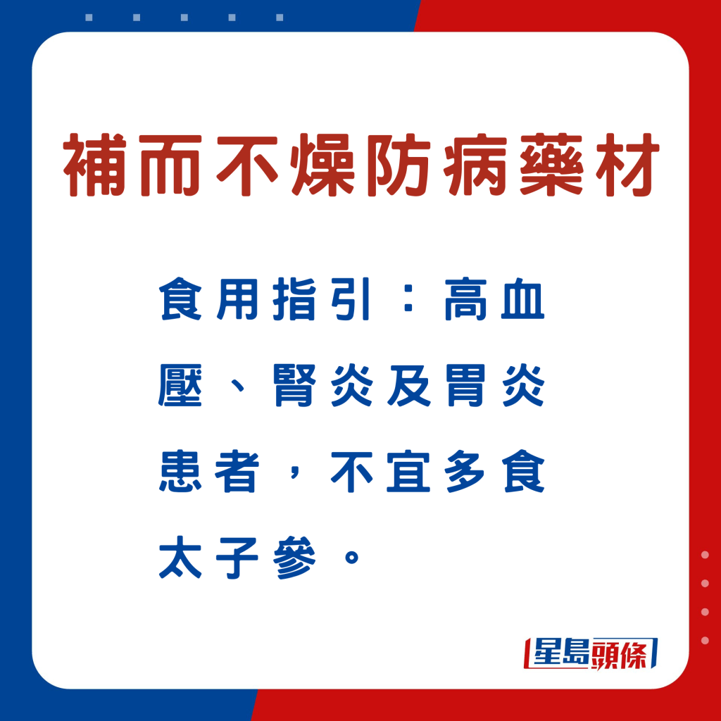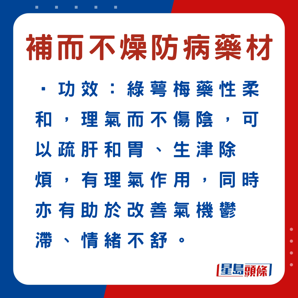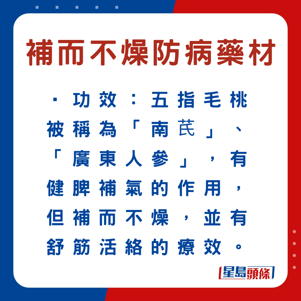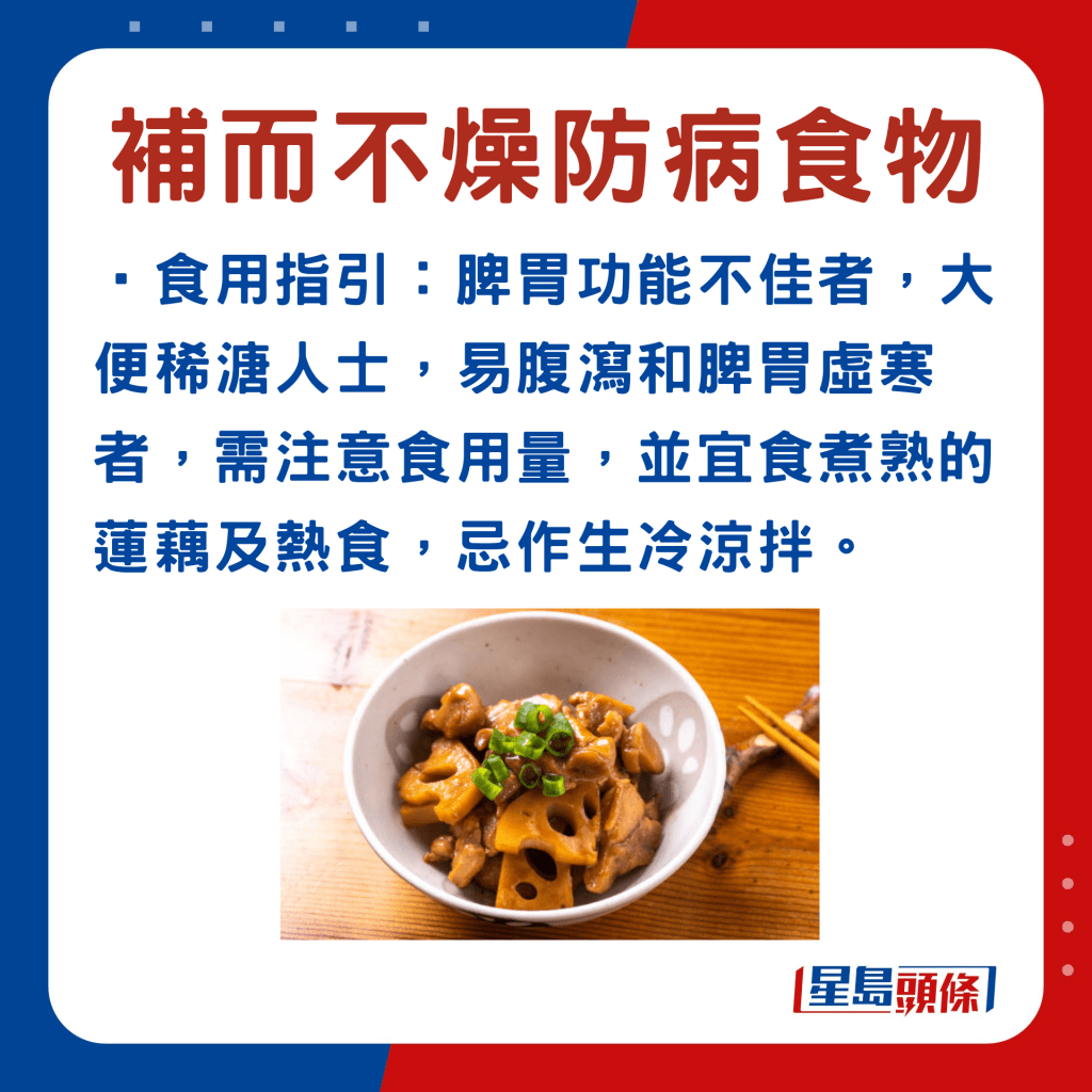 另外,以下6款中藥材,例如玉竹等,符合深秋“平補(bǔ)”原則,同時(shí)有助加強(qiáng)脾胃、肺腎、肝臟等功能,以增強(qiáng)人體抵抗力,有利防病。食物例子、功效及食用宜忌如下:
