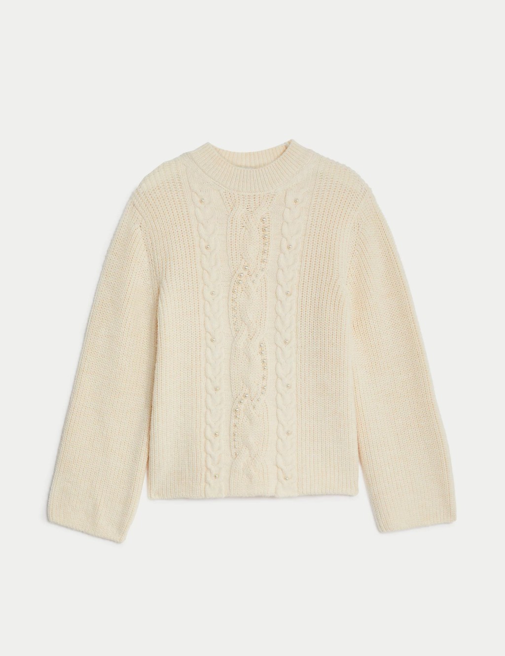 ▲即日至10月31日,于馬莎以正價選購針織衫2件或以上8折,圖為綴飾扭紋針織花圓領(lǐng)毛衣/HK$449。 (馬莎)