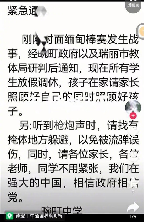 “極目新聞”報道,一份落款為“畹町中學(xué)”的網(wǎng)傳微信截圖顯示,該校通知稱,因緬甸棒賽發(fā)生戰(zhàn)事,所有學(xué)生放假調(diào)休,若老師同學(xué)聽到槍炮聲,要找有掩體地方躲避,以免遭流彈誤傷。