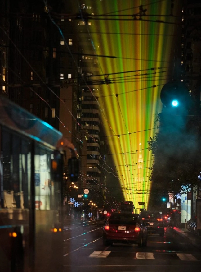 激光秀點(diǎn)亮舊金山夜空。 Illuminate SF提供