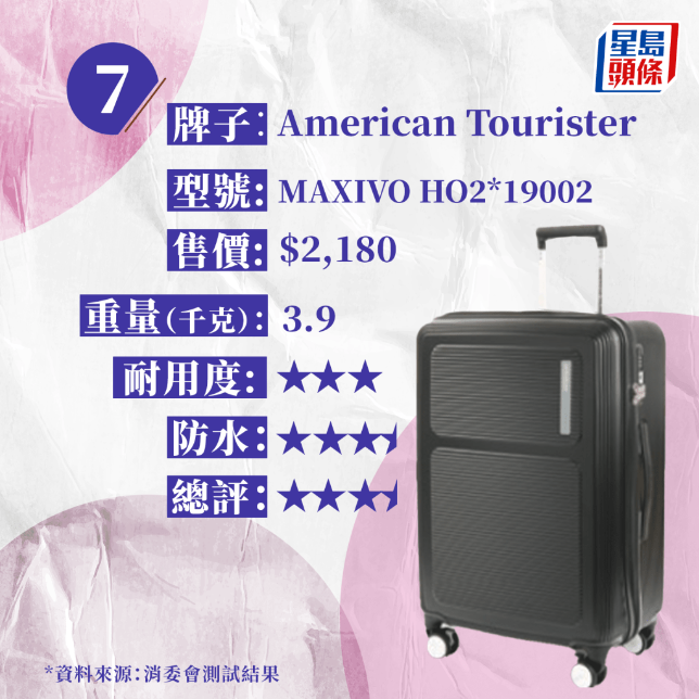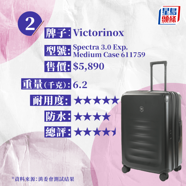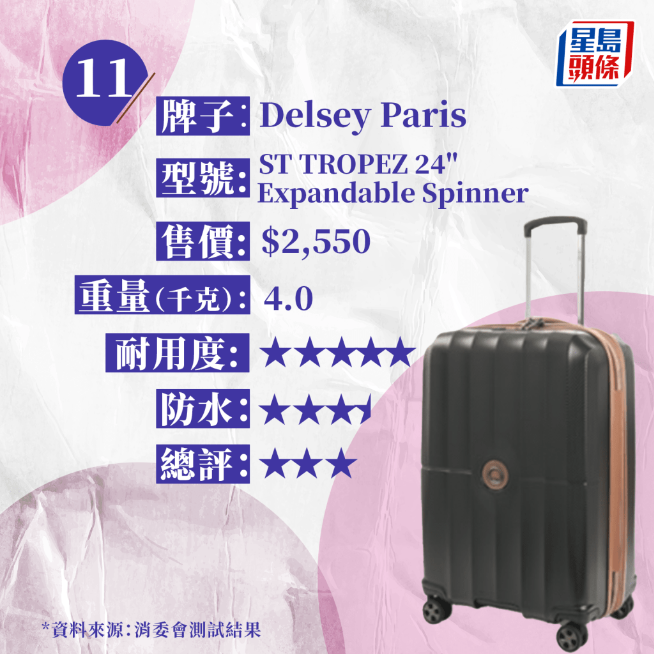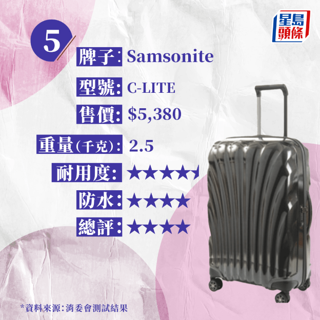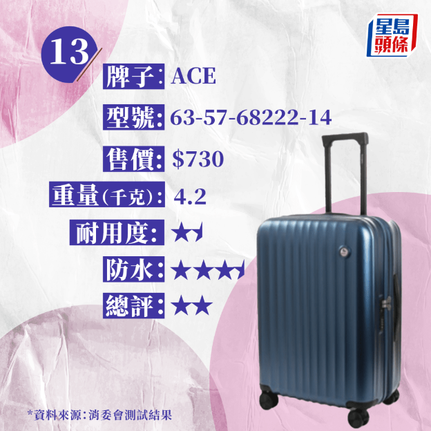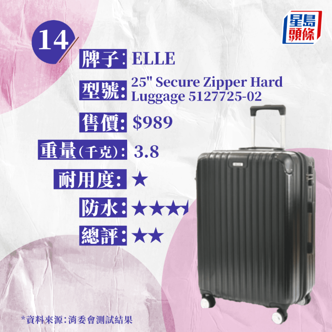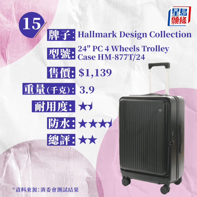 是次測(cè)試的15款樣本均為中型硬身行李箱,高度約24吋至28吋,屬于寄艙行李類別,全部配備可供海關(guān)人員以保安鑰匙打開檢查的TSA密碼鎖,外殼均由膠料制造,重量約由2.5千克至6.2千克,售價(jià)由730元至8,200元,相差逾10倍。