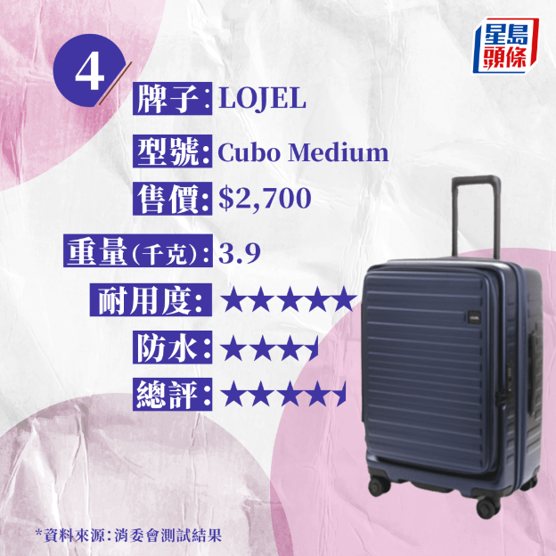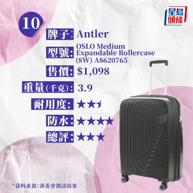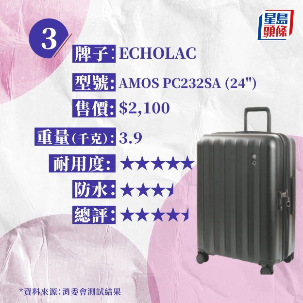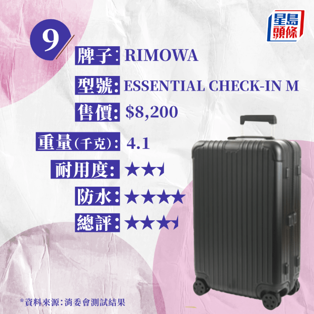 整體評(píng)分最高(4.5分)的4款樣本中,有2款售價(jià)為2,500元以下,分別為“Muji 行李箱連滑輪固定器75L”(約1980元)及“ECHOLAC AMOS PC232SA(24″)”(約2100元)。而售價(jià)最高的1款“RIMOWA ESSENTIAL CHECK-IN M”( 約8,200元),整體評(píng)分僅獲3.5分,特別在路面行走性能與拉桿強(qiáng)度方面,在行走路程未及 60公里時(shí),拉桿手柄便斷裂,表現(xiàn)強(qiáng)差人意。