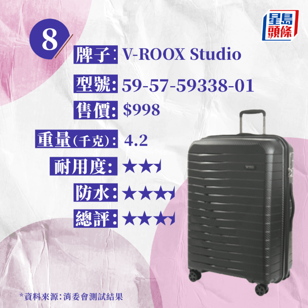 圣誕新年旅游旺季即將來臨,不少人會(huì)買行李箱準(zhǔn)備外游。消委會(huì)測(cè)試15款中型硬身拉鏈?zhǔn)叫欣钕涞哪陀煤突瘜W(xué)安全程度,其中7款樣本經(jīng)長(zhǎng)距離拖行后,分別出現(xiàn)車輪脫落、箱身破裂、拉桿或拉桿手柄折斷、松脫等情況。售價(jià)最高的“RIMOWA ESSENTIAL CHECK-IN M”(約8,200元(港幣,下同)),整體評(píng)分僅獲 3.5 分,在行走路程未及 60公里時(shí),拉桿手柄便斷裂。其中一款樣本的手挽有部分物料檢出的塑化劑含量超出歐盟REACH法規(guī)訂立的上限45倍,或會(huì)影響生殖健康。
