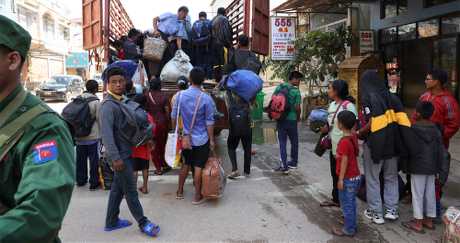 緬北撣邦果敢自治區(qū)叛軍將一批投降的政府軍及其家人趕上一輛卡車(chē)。