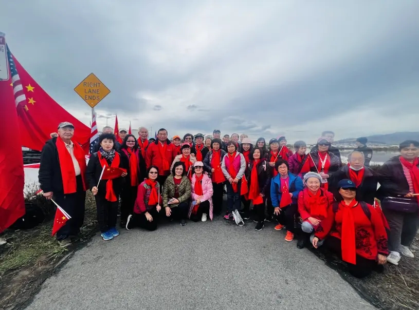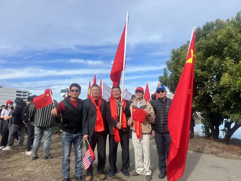 大批僑胞在舊金山國際機(jī)場外的海傍揮舞五星紅旗,準(zhǔn)備歡送習(xí)近平主席。