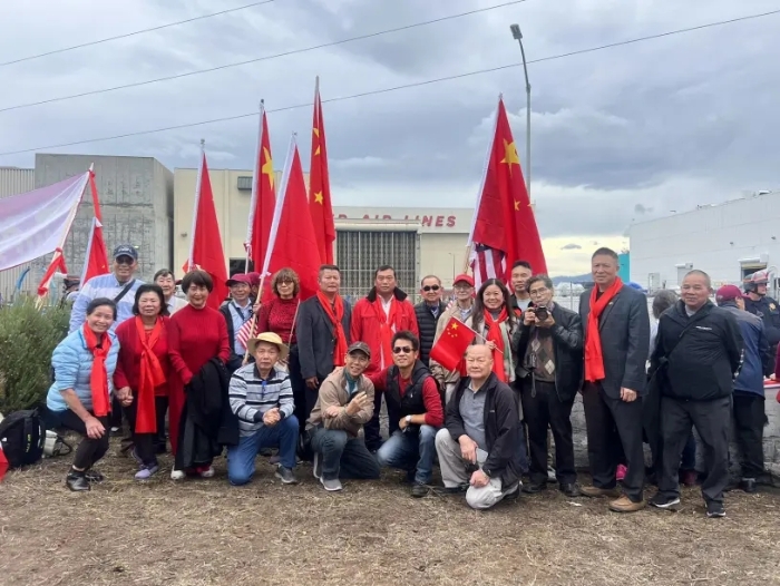 ▲大批僑胞在舊金山國(guó)際機(jī)場(chǎng)外的海傍揮舞五星紅旗,準(zhǔn)備歡送習(xí)近平主席。