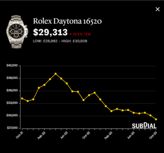 Subdial共同創(chuàng)辦人Christy Davis表示,二手市場上的手表數(shù)量自8月以來已增加5%。隨著供應(yīng)量增加以及出售庫存的時(shí)間更長,二手手表經(jīng)銷商降低估值以刺激銷售,或?qū)е律萑A手表價(jià)格進(jìn)一步走弱。
