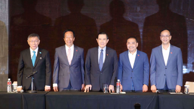 針對在野陣營整合,在民眾黨2024大選的參選人柯文哲(左起)邀請下,鴻海創(chuàng)辦人郭臺銘、臺灣前領(lǐng)導人馬英九、國民黨2024大選參選人侯友宜、國民黨主席朱立倫一同出席。