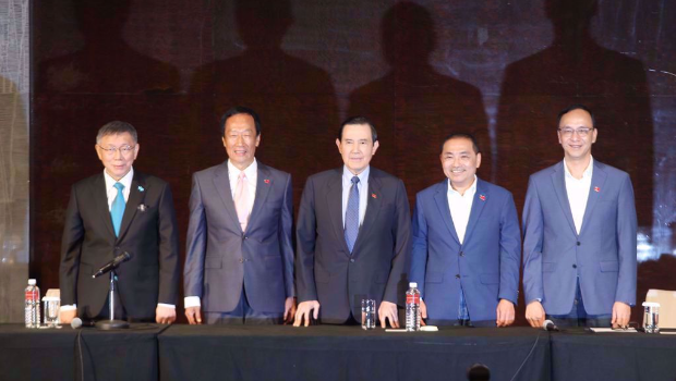 在野陣營于23日在君悅飯店討論整合,柯文哲(左起)、郭臺(tái)銘、馬英九、侯友宜、朱立倫一同出席。