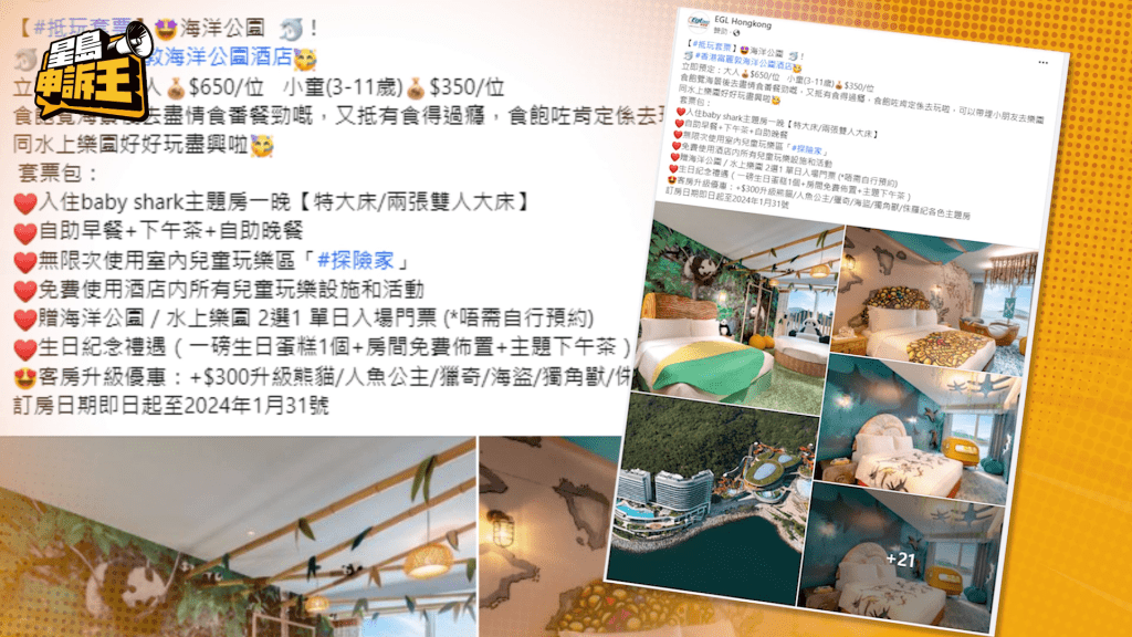 《星島申訴王》記者在Facebook發(fā)現(xiàn)兩個賣本地旅游套票的專頁,優(yōu)惠廣告上有齊靚相,兩個專頁的賣家分別出售四星級的黃金海岸酒店,以及五星級的富麗敦海洋公園酒店套票,更稱有至抵價,最平550元一位大人,費用已包括一晚酒店連早餐及晚餐自助餐,可謂是打骨折。