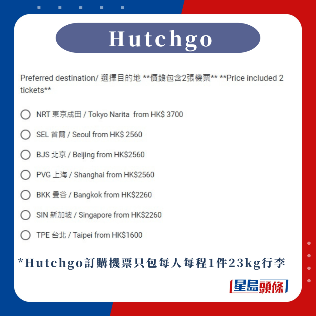 Hutchgo:如欲了解詳情或購買機(jī)票,可致電旅游專線3192 0900、電郵至 leisurehk@hutchisontravel.com與旅游專員聯(lián)絡(luò)或按此填寫指定表格