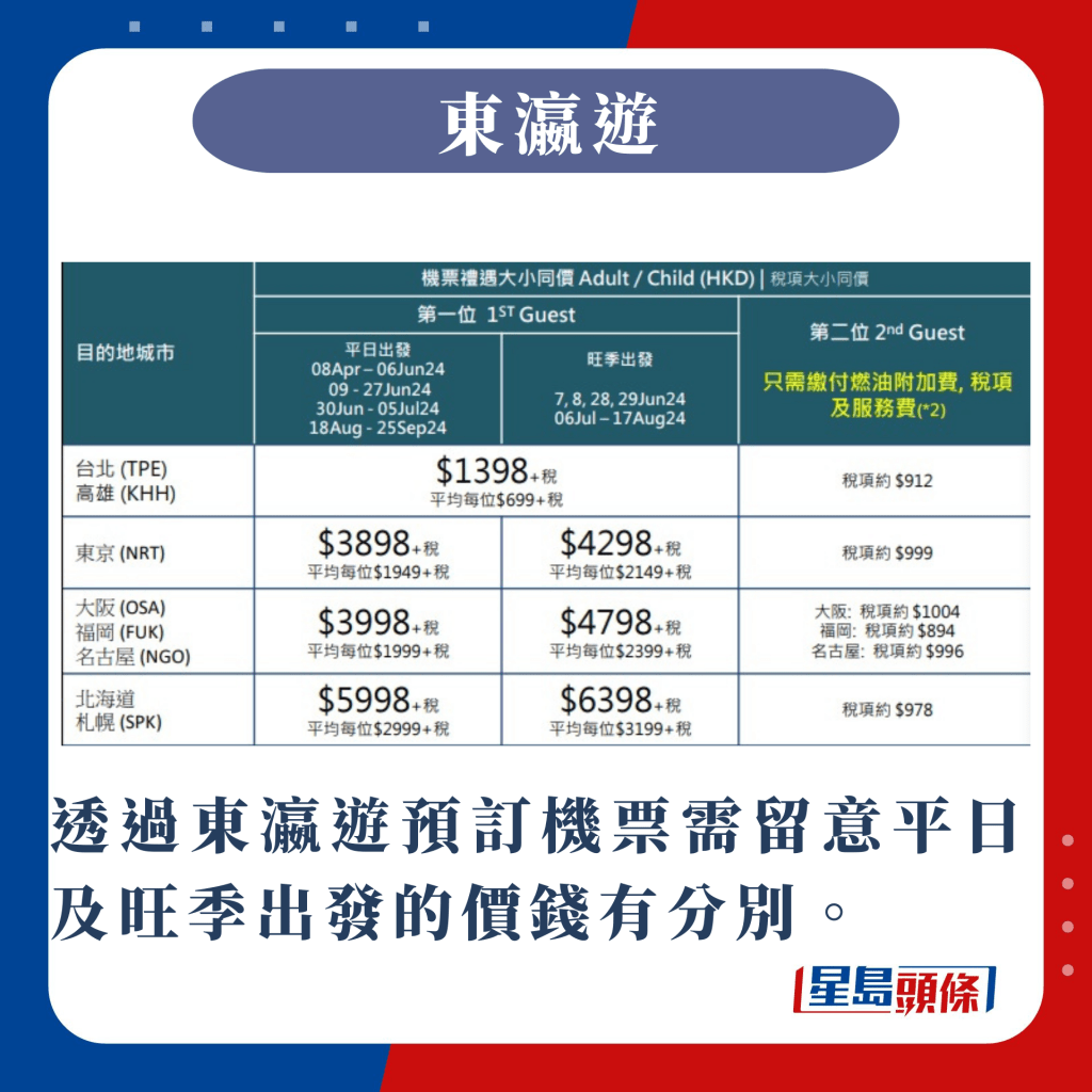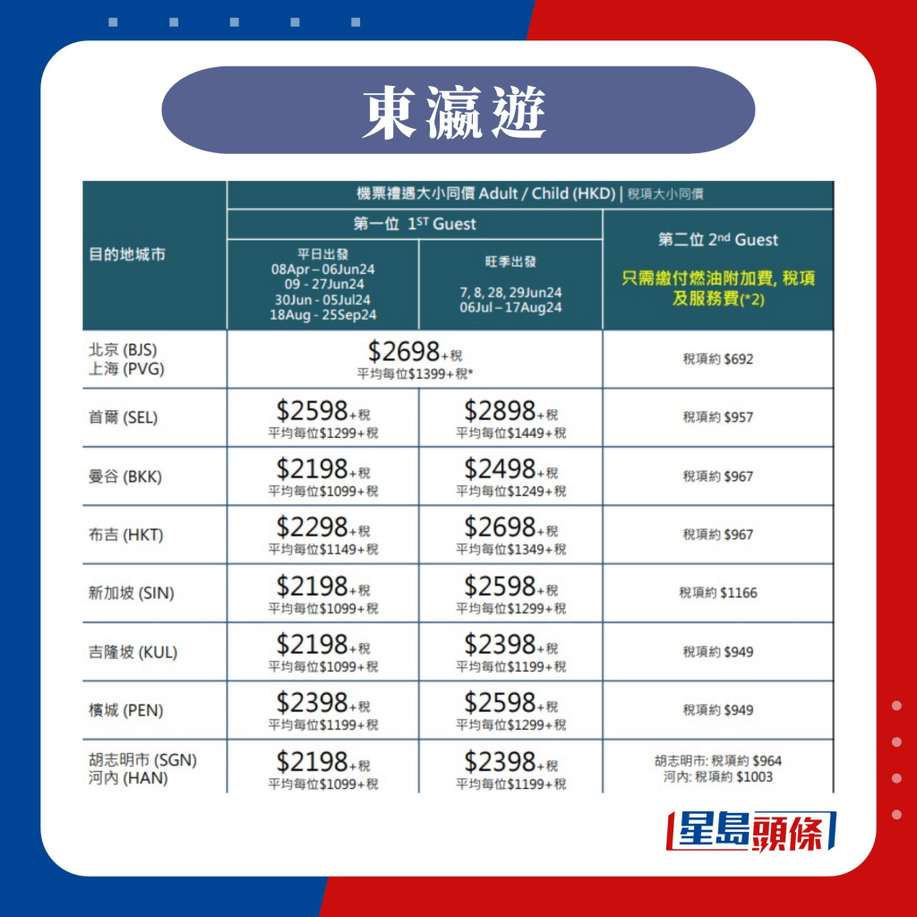 今次國泰機(jī)票買一送一優(yōu)惠與7間本地旅行社合作,短途航點(diǎn)非常吸引,包括港人最愛的日韓臺、東南亞及內(nèi)地部分熱門城市。 國泰優(yōu)惠機(jī)票必須為二人同行,優(yōu)惠價格未連稅項(xiàng)及手續(xù)費(fèi),預(yù)訂日期為2023年11月28日至12月11日,換言之于此日期內(nèi)出機(jī)票才能享有買一送一優(yōu)惠。 大家留意出發(fā)日期為2024年4月8日至9月25日,惟此優(yōu)惠并不適用于網(wǎng)上預(yù)訂或部份旺季出發(fā)日子,以各間旅行社最終決定為準(zhǔn)。